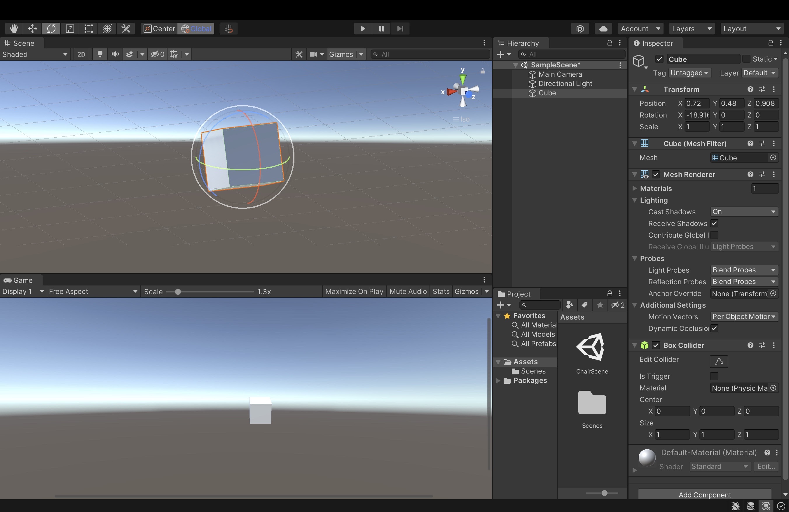 2. Hierarchy → Cube 선택!! → Scene창에 마우스 커서 올리고 F키 누름