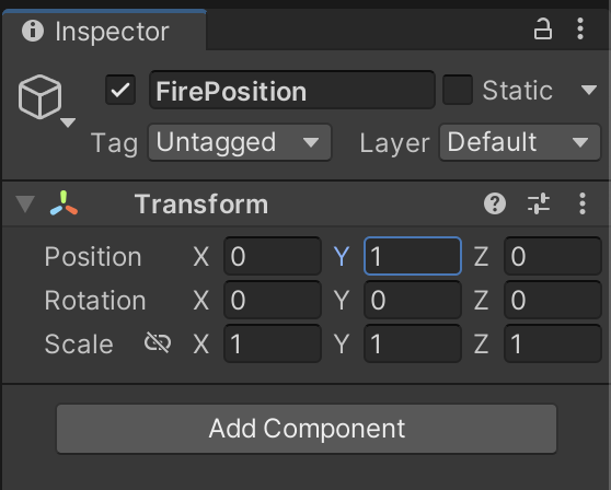 ✔︎ Fire Position의 y위치를 1로 변경 (즉 FirePosition은 (0, 1, 0)에 위치 )