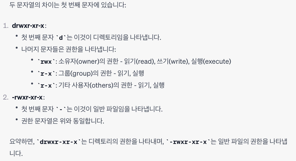 drwxr-xr-x 와 -rwxr-xr-x 의 차이 : 파일 타입 차이