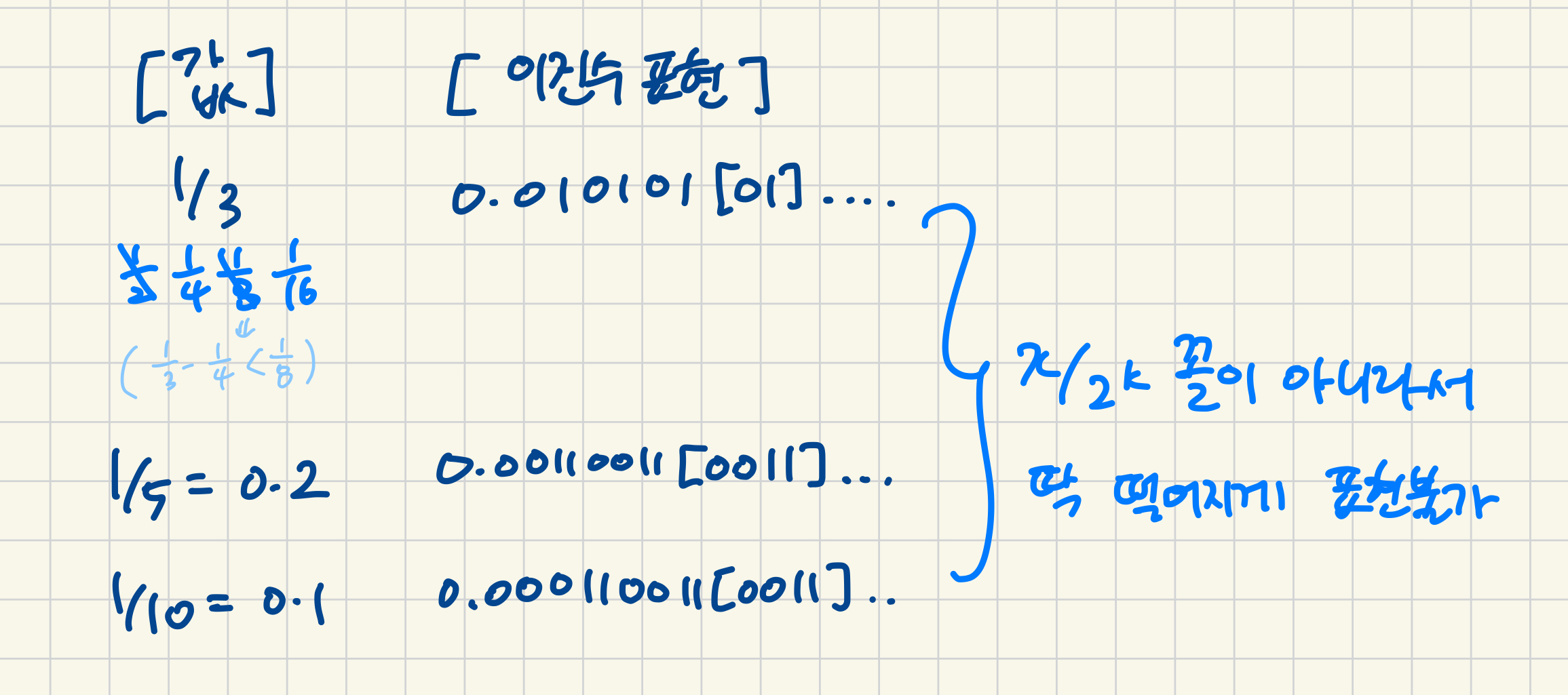 오직 x/2^k 꼴 만이 정확한 이진숫자로 표현 가능