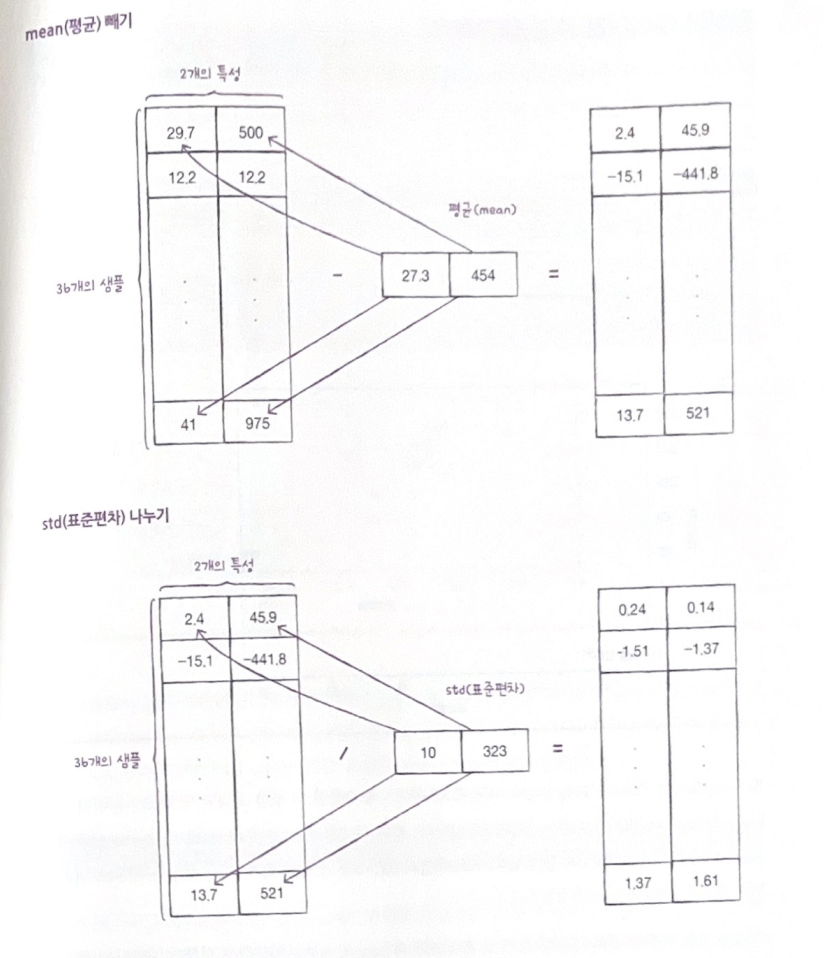 표준 점수 : 훈련 세트의 스케일을 바꾸는 방법 중 하나, (원본 데이터 - 평균)/표준 편차 , 모든 세트 다 바꿔야 함