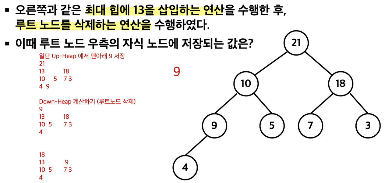 - 최대 힙의 원리를 깨지 않게끔 삽입된 노드를 움직임