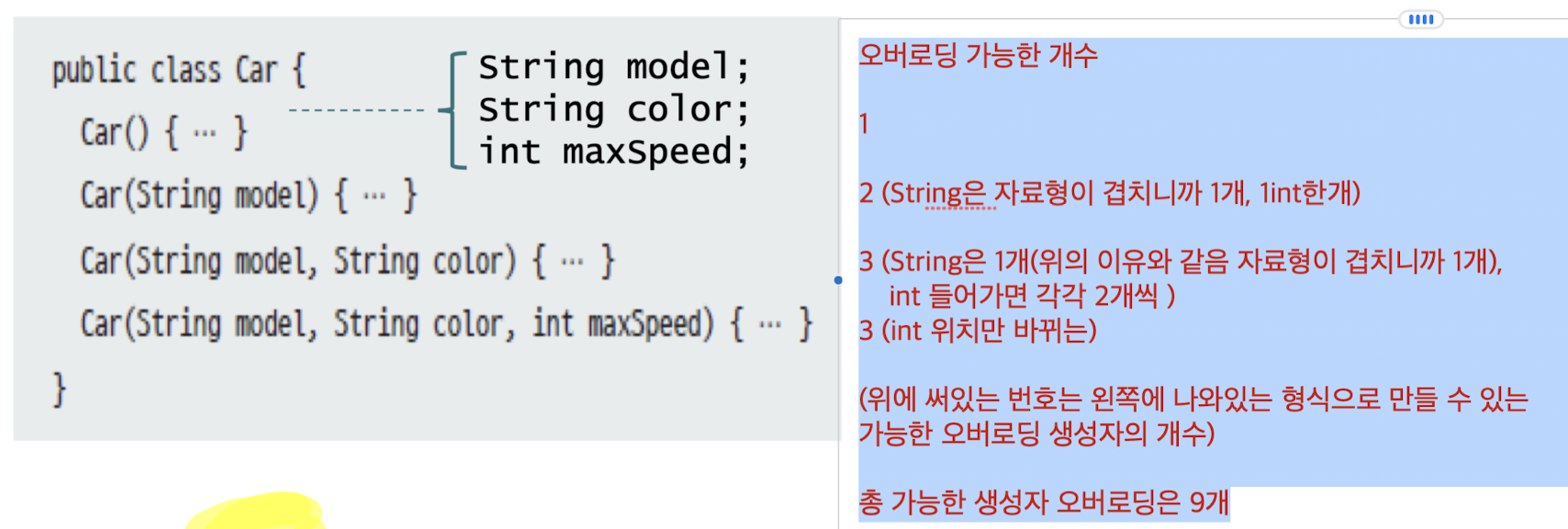- 매개변수 타입, 개수, 선언된 순서가 같은 경우, 매개변수 이름만 바꾸는 건 생성자 오버로딩이 아님