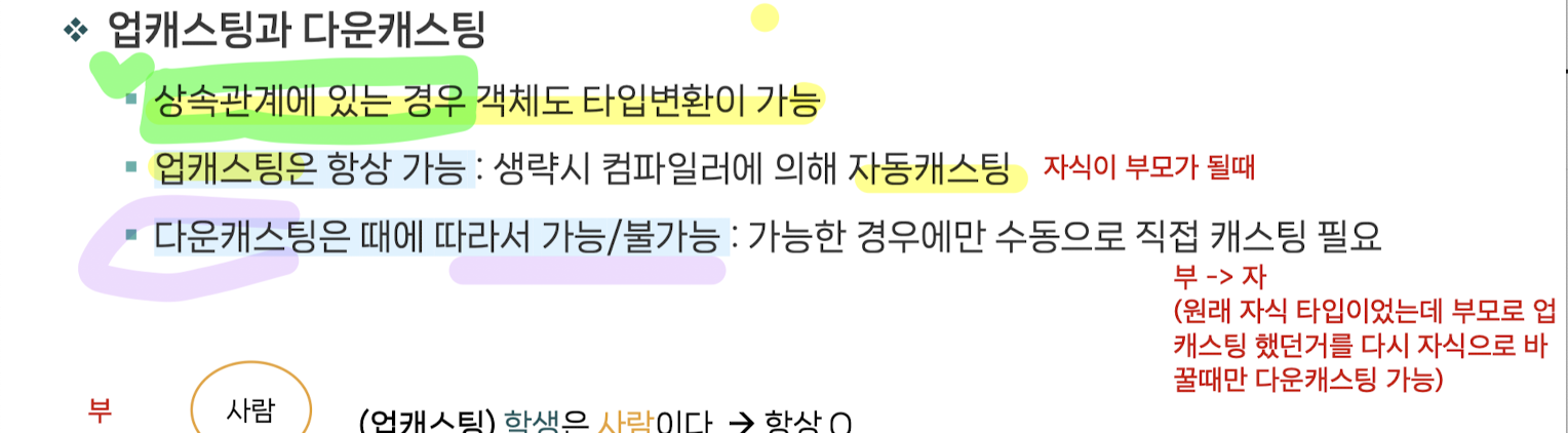 업캐스팅 : 메모리가 큰거에서 더 적은 거로 바꿈 (자식 객체를 부모타입으로 선언)