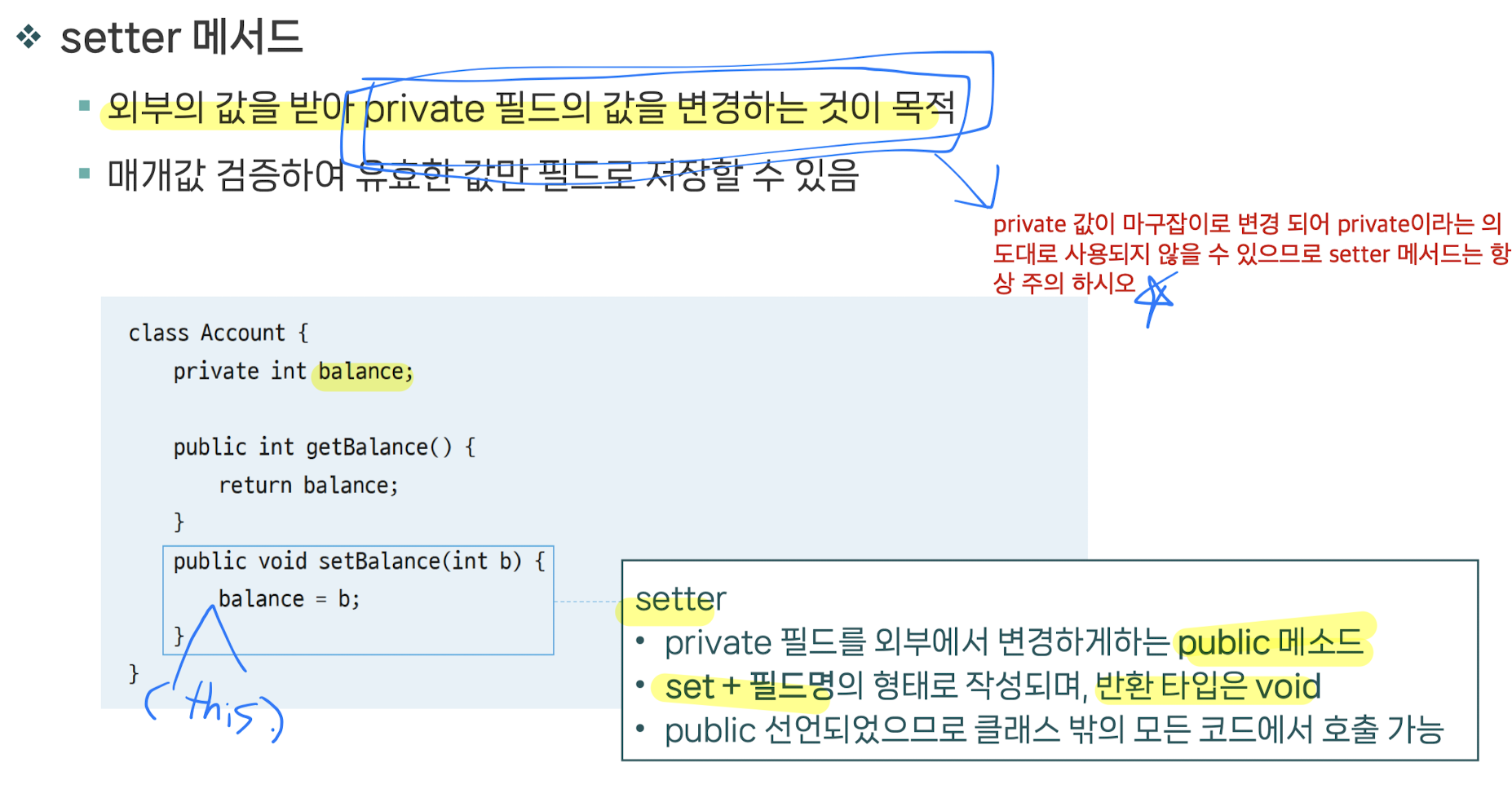 : 외부에서 객체에 마음대로 접근시 객체의 무결성이 깨질 수 있으므로,