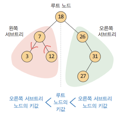 : 좌측 서브 트리 값 < 임의 노드 (루트) 값 < 우측 서브 트리 값