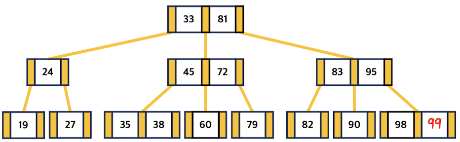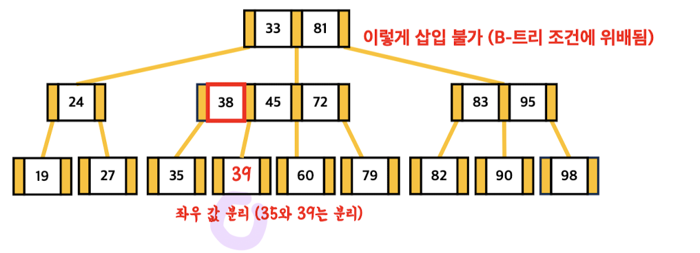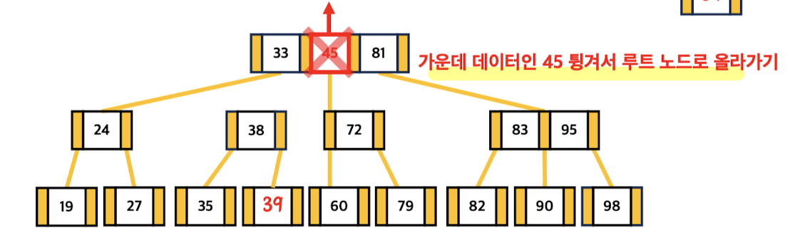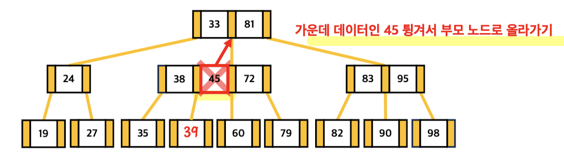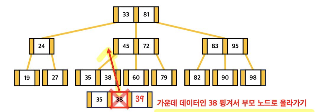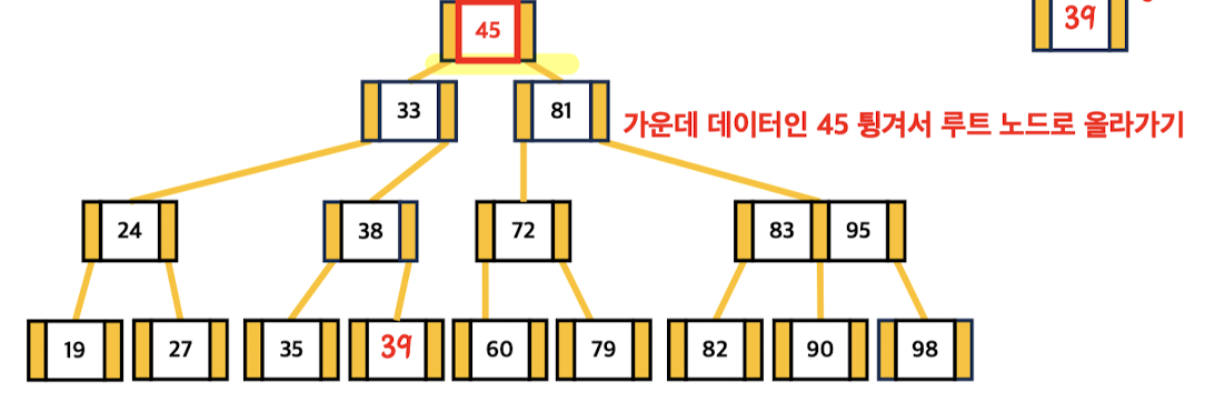 - 리프 노드에 데이터가 삽입될 여유가 없을 경우, 가운데 데이터를 튕겨내는 과정을 반복
