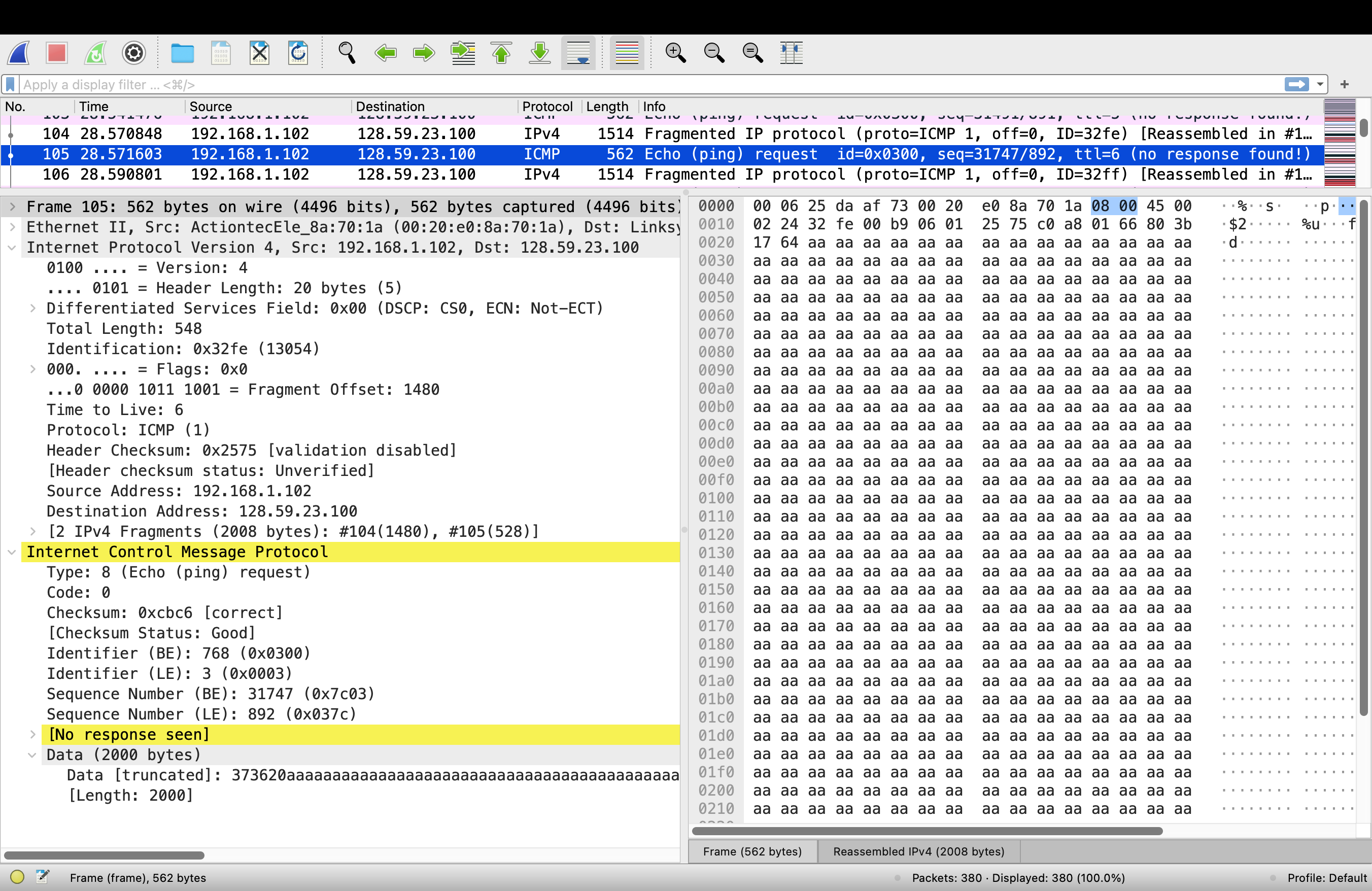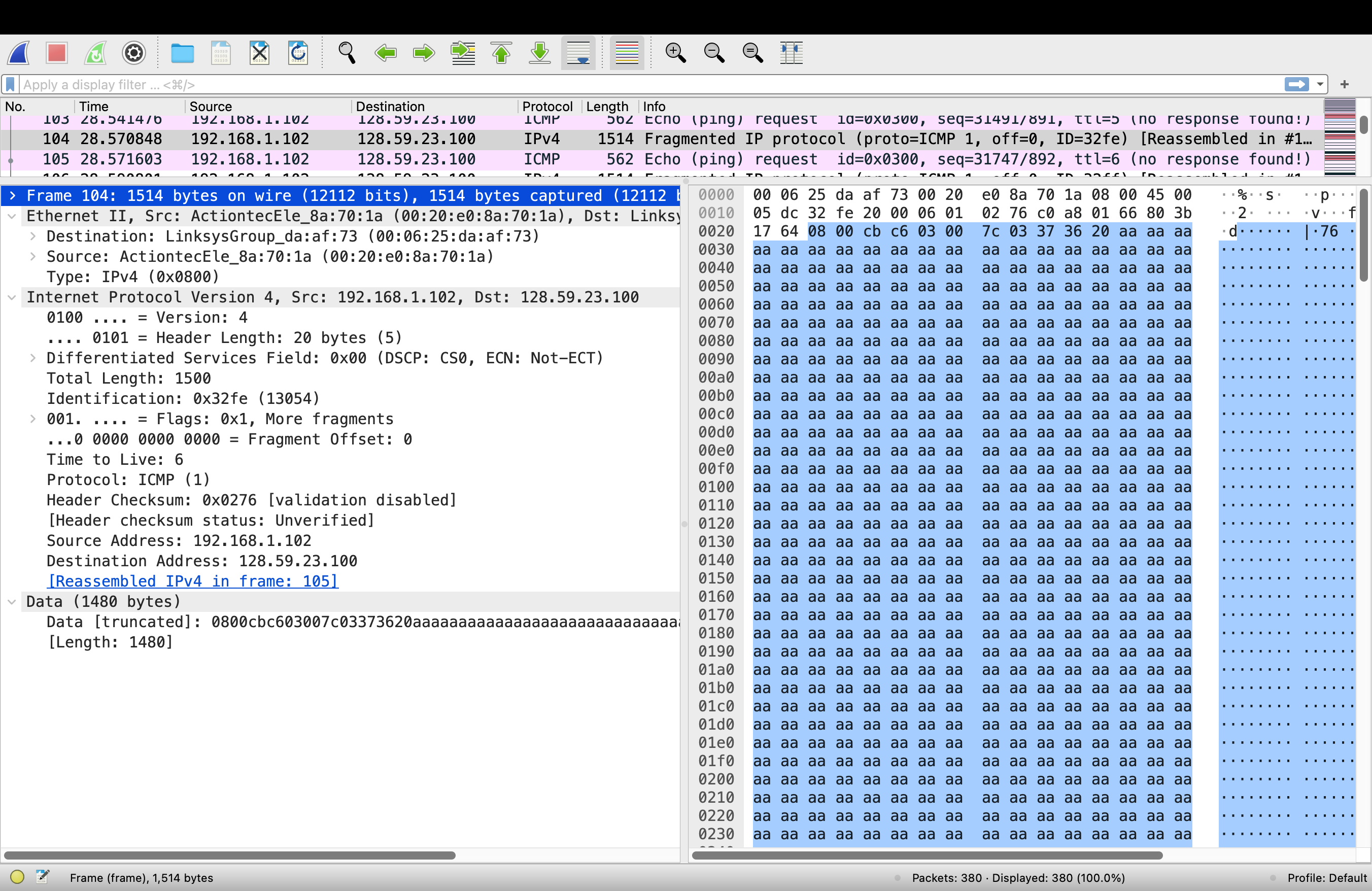>> 104번 패키지의 Fragment Offset : 0 에서 첫번째 단편임을 알 수 있다.