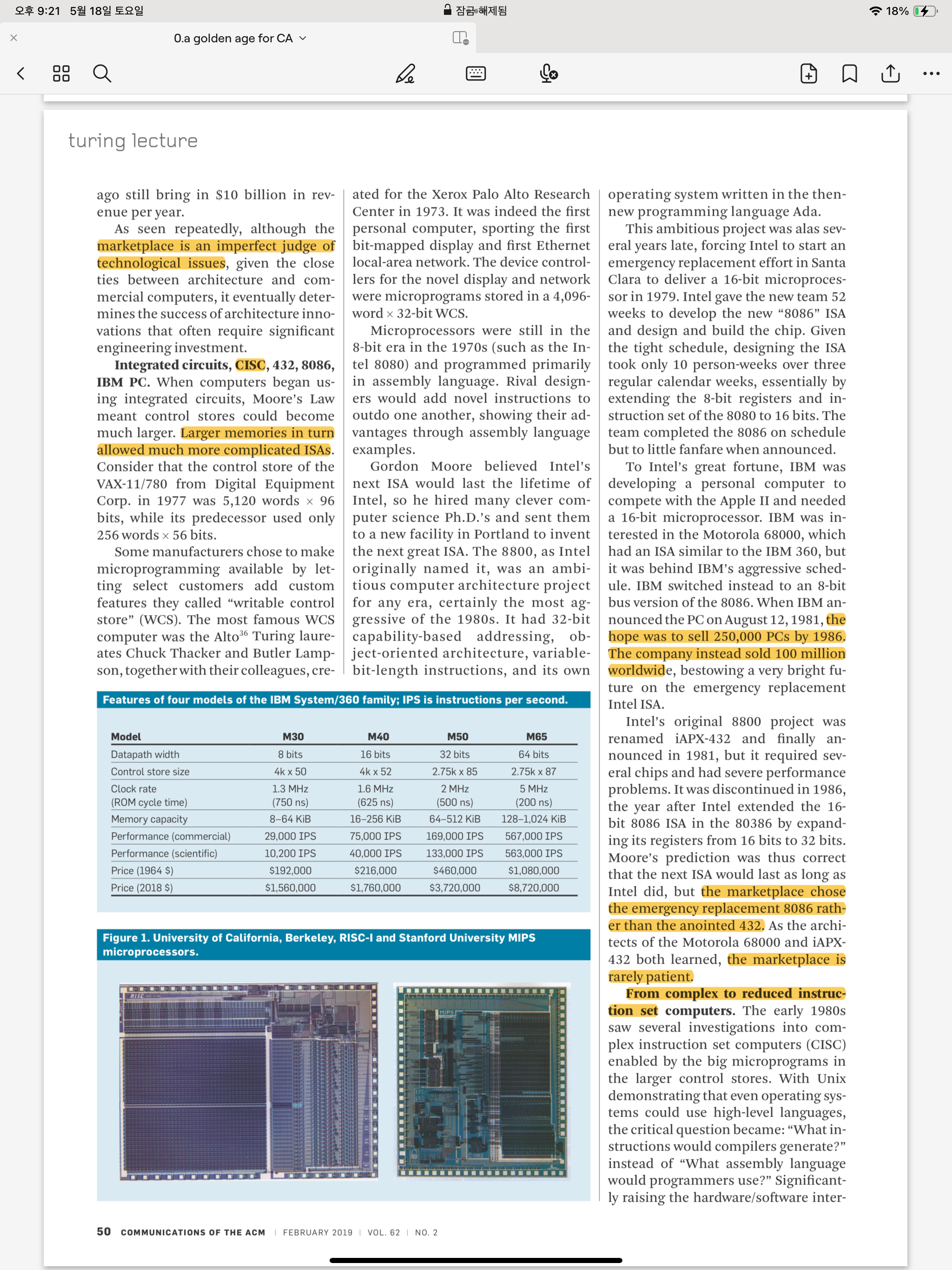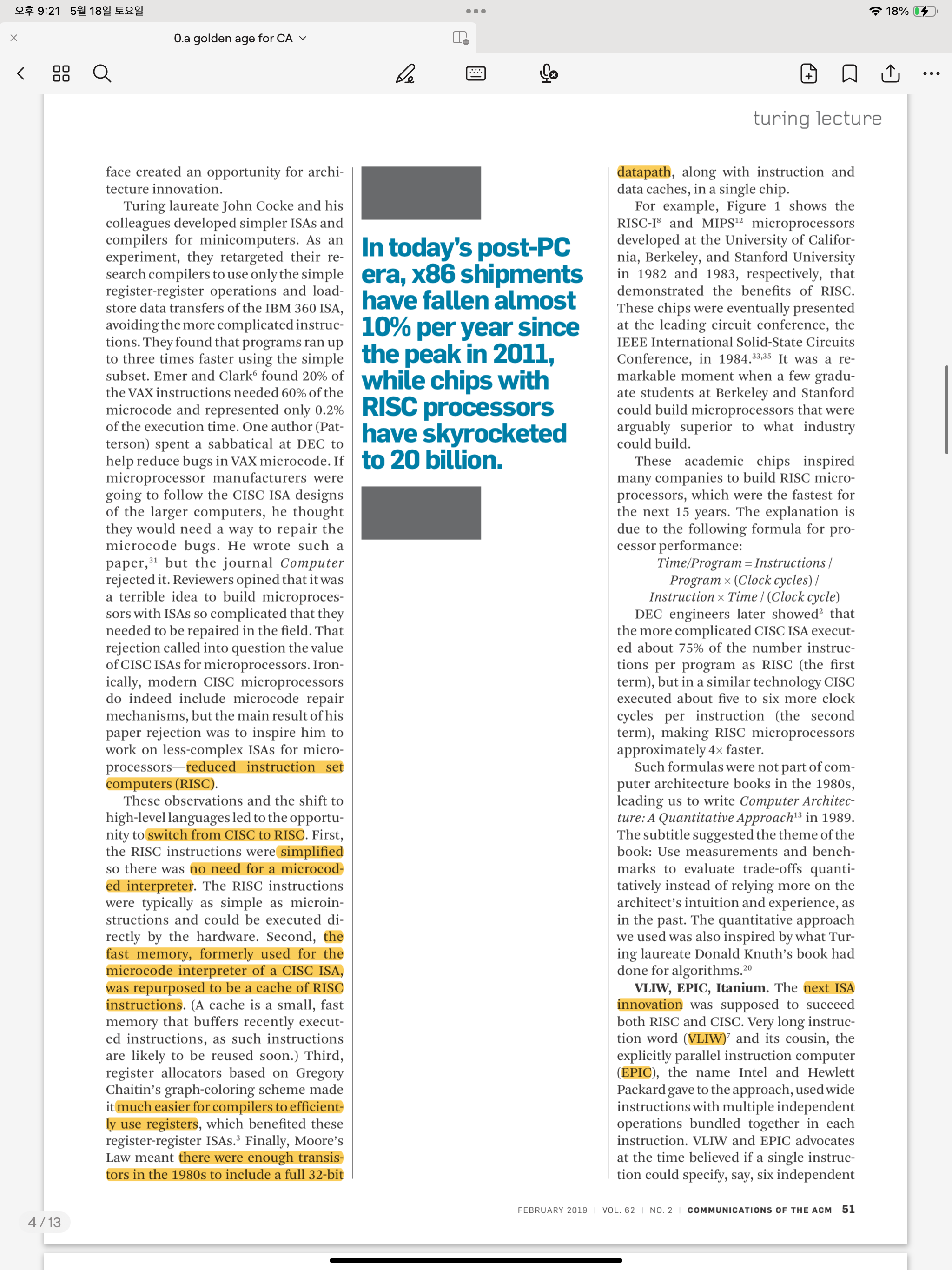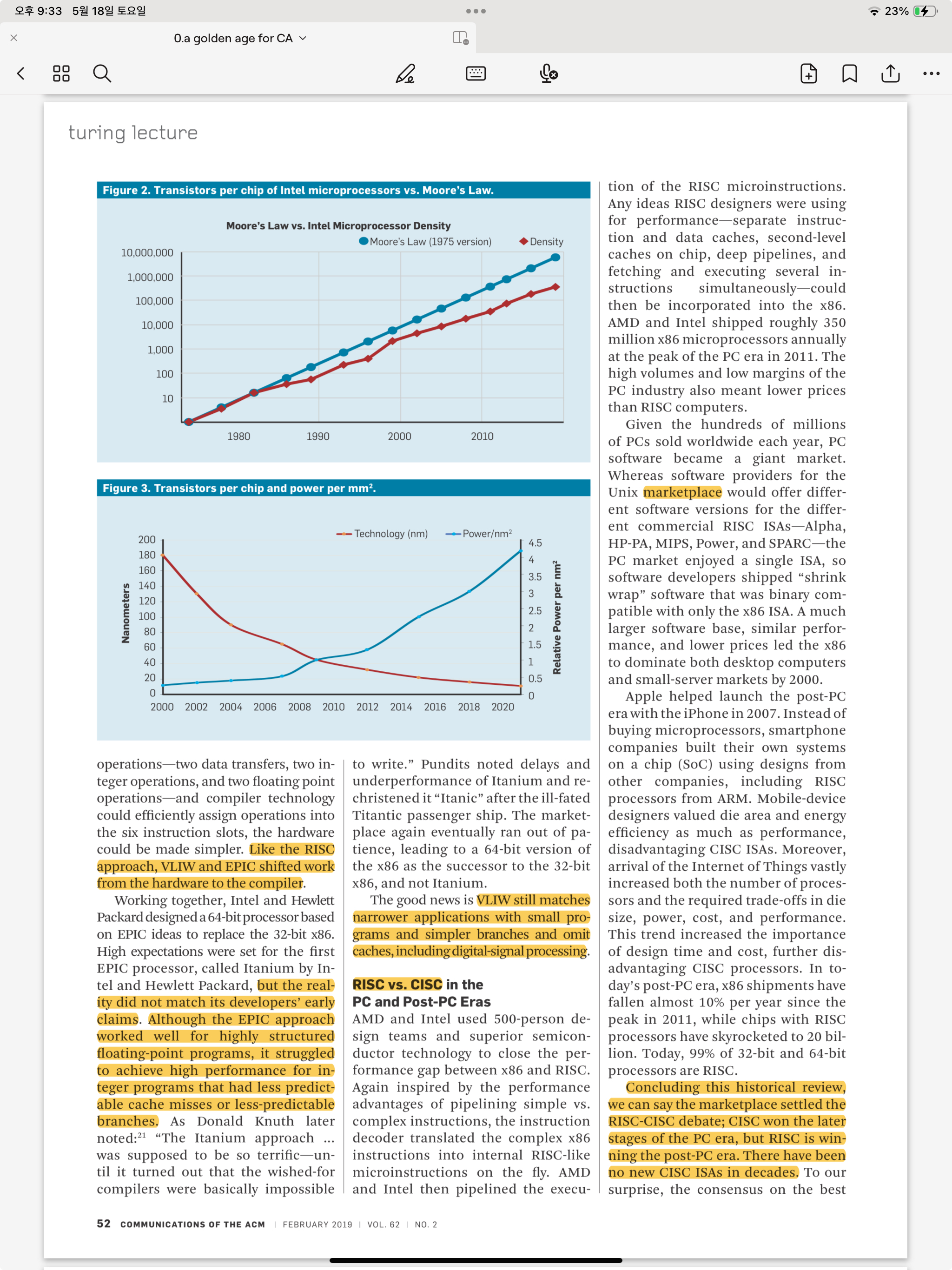 PC 시대 후반에는 CISC가 승자엿지만 포스트 PC시대(현재 막 휴대)에서는 RISC가 이김 오