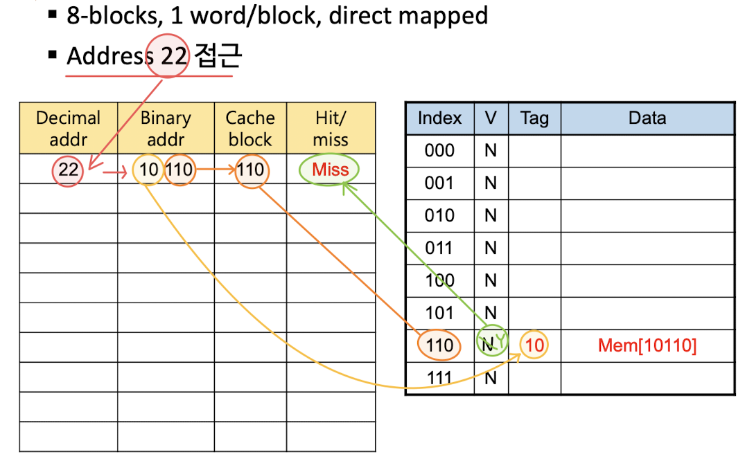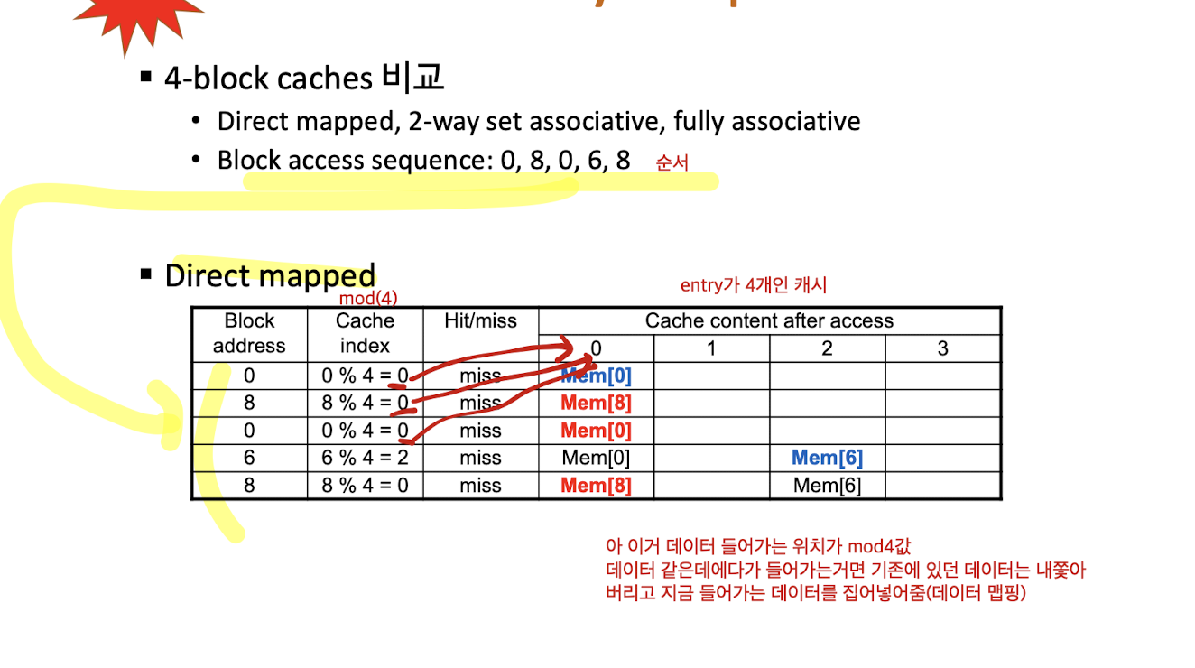 ➡️ Fully 에서는 블록이 캐시 어느 곳에나 들어갈 수 있지만, n-way는 set내에서만 들어갈 수 있다