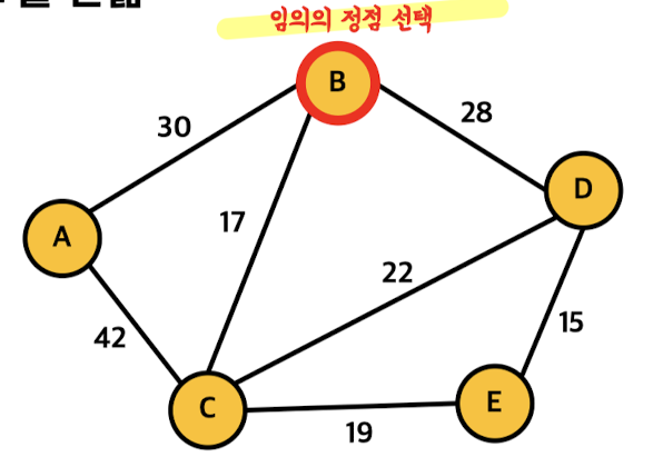 Step1) 임의의 정점에서 가장 적은 비용으로 자신에게 이을 수 있는 정점을 선택 ( 비용 적은 걸로 이음)