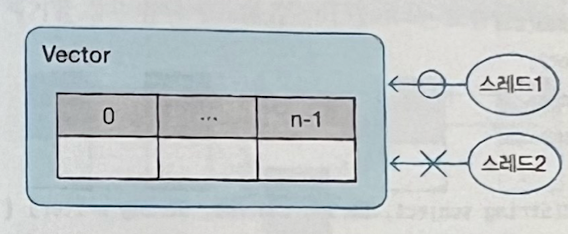 - Vector는 동기화된(synchronized) 메소드로 구성되어 있기 때문에 멀티 스레드가 동시에 Vector의 메소드를 실행할 수 없음