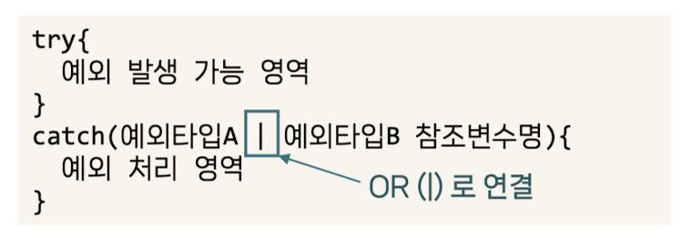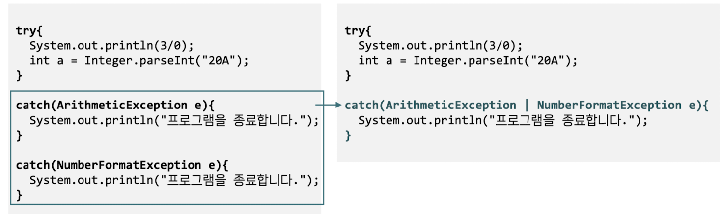 : 하나의 catch 블록에서 여러개의 예외 처리 가능