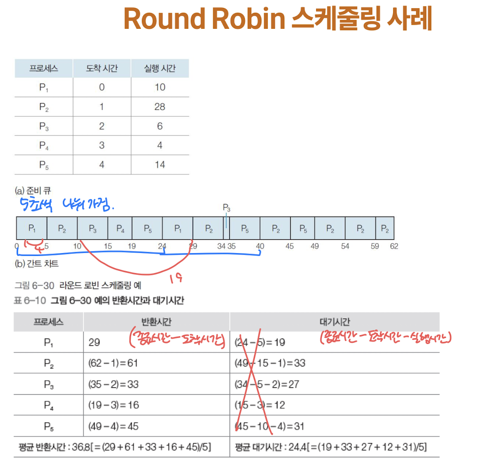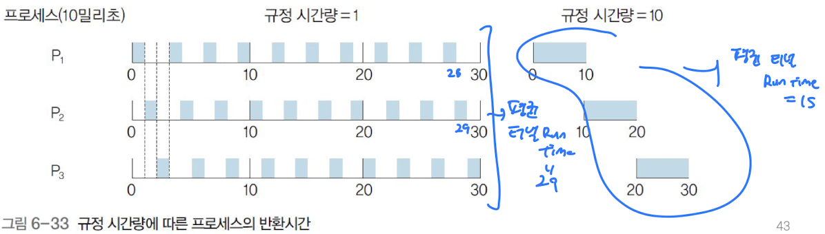 - ** 규정시간량이 작으면 문맥 교환을 많이 하므로 평균 반환시간이 더 길어짐 **