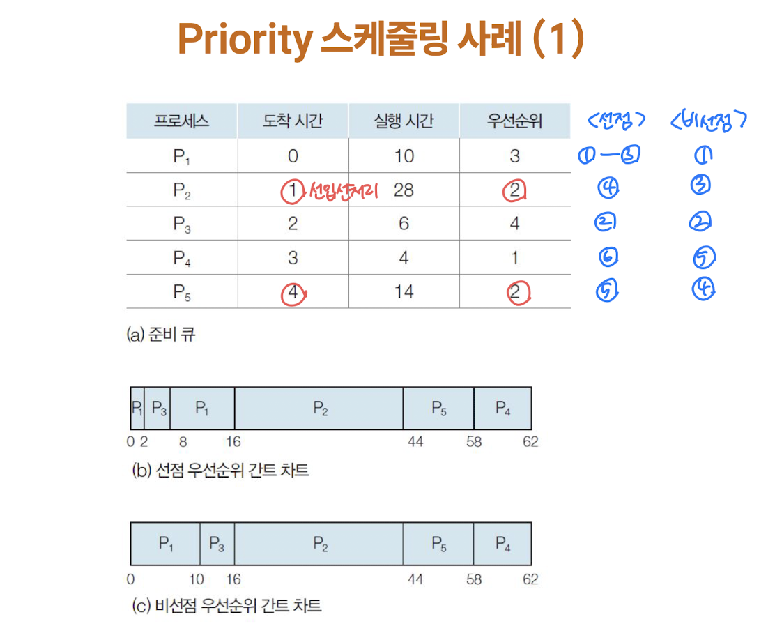 Priority (선점/비선점 스케줄링 둘 다 구현 가능)