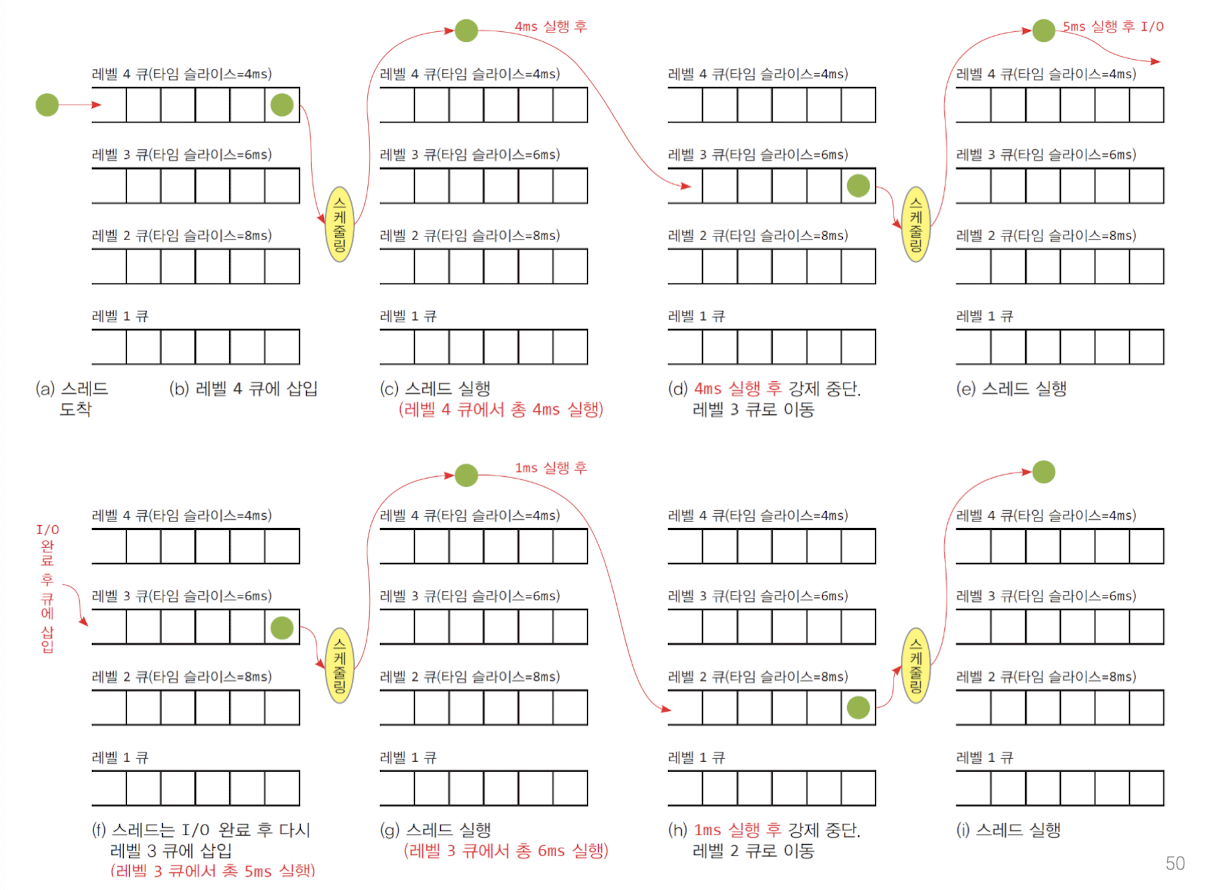 : 높은 순위의 큐에서 스레드 스케줄링, 높은 순위의 큐가 빌 때 아래 순위의 큐에서 스케줄링