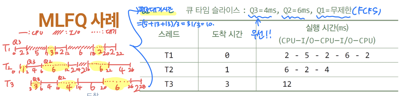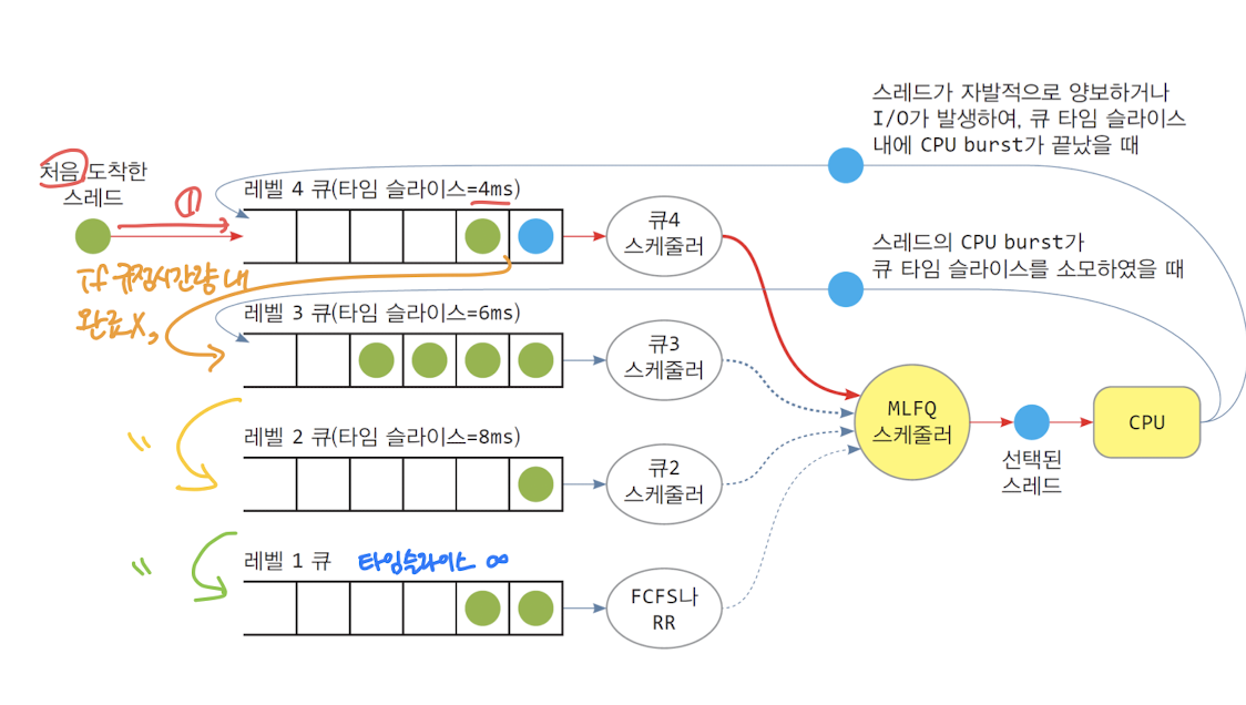 : 스레드는 제일 높은 순위의 큐에 진입하고 큐타임슬라이스가 다하면 아래 레벨의 큐로 이동