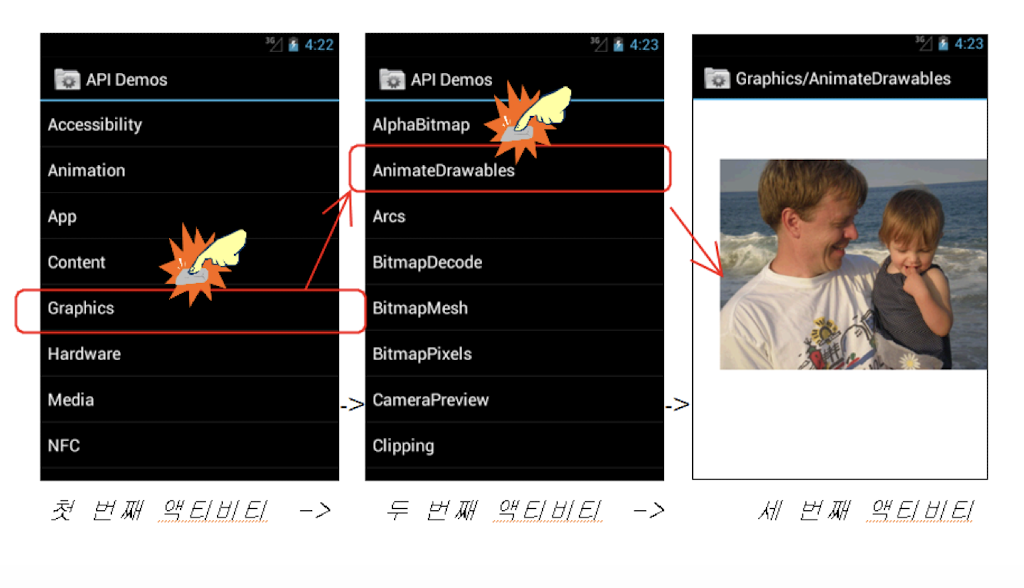 : 액티비티가 생성될 떄는 생명주기 메소드 중 하나인 onCreate() 메소드가 호출되므로 이 메소드에 원하는 동작을 정의