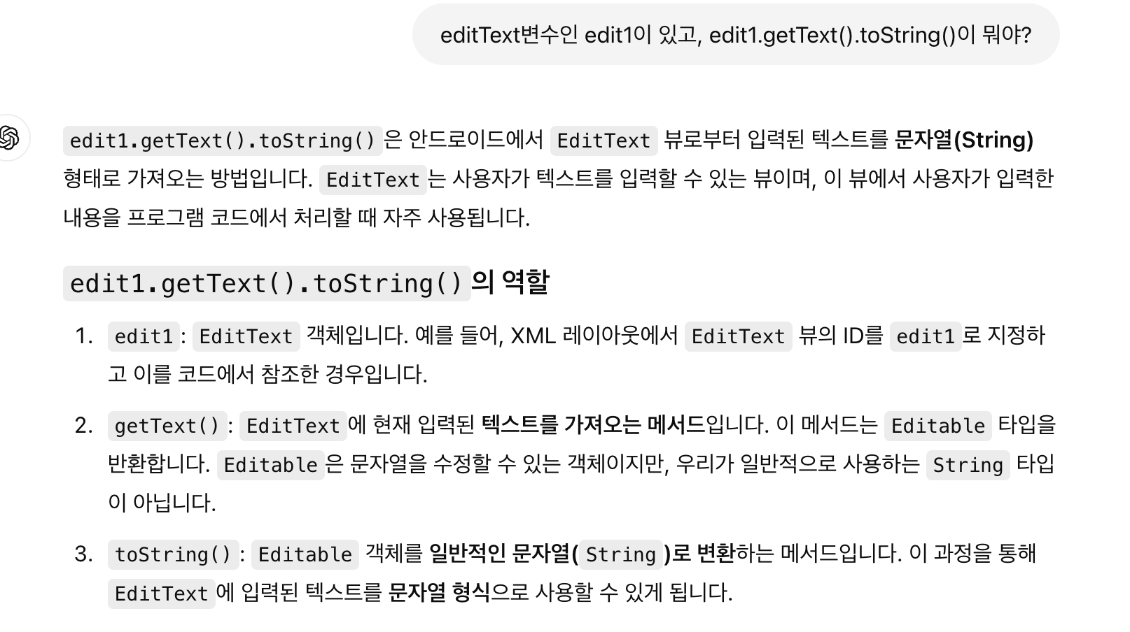 num1 = edit1.getText().toString(); // getText() : EditText에 현재 입력된 텍스트를 가져옴