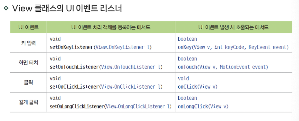 이벤트 리스너 : View 클래스네 속한 인터페이스,