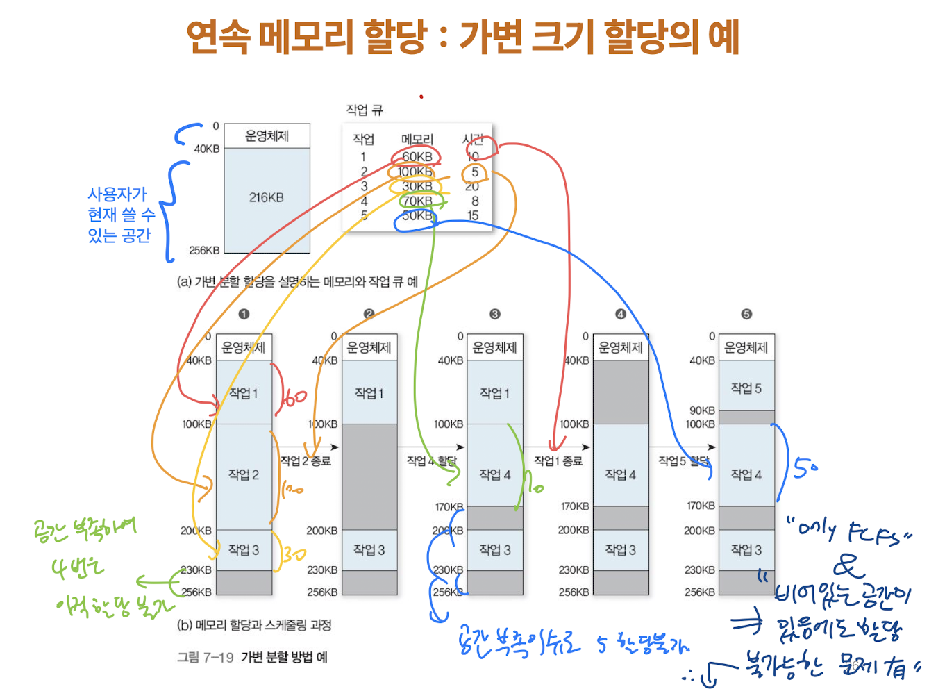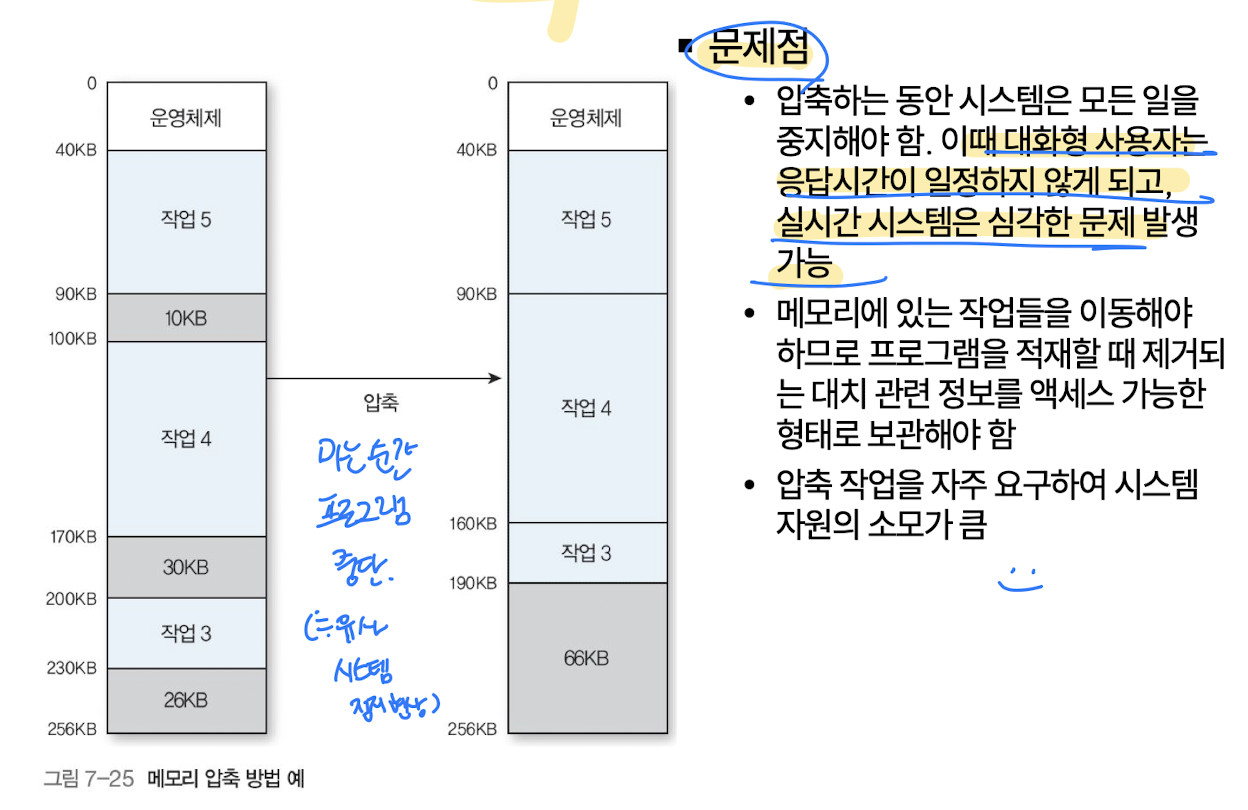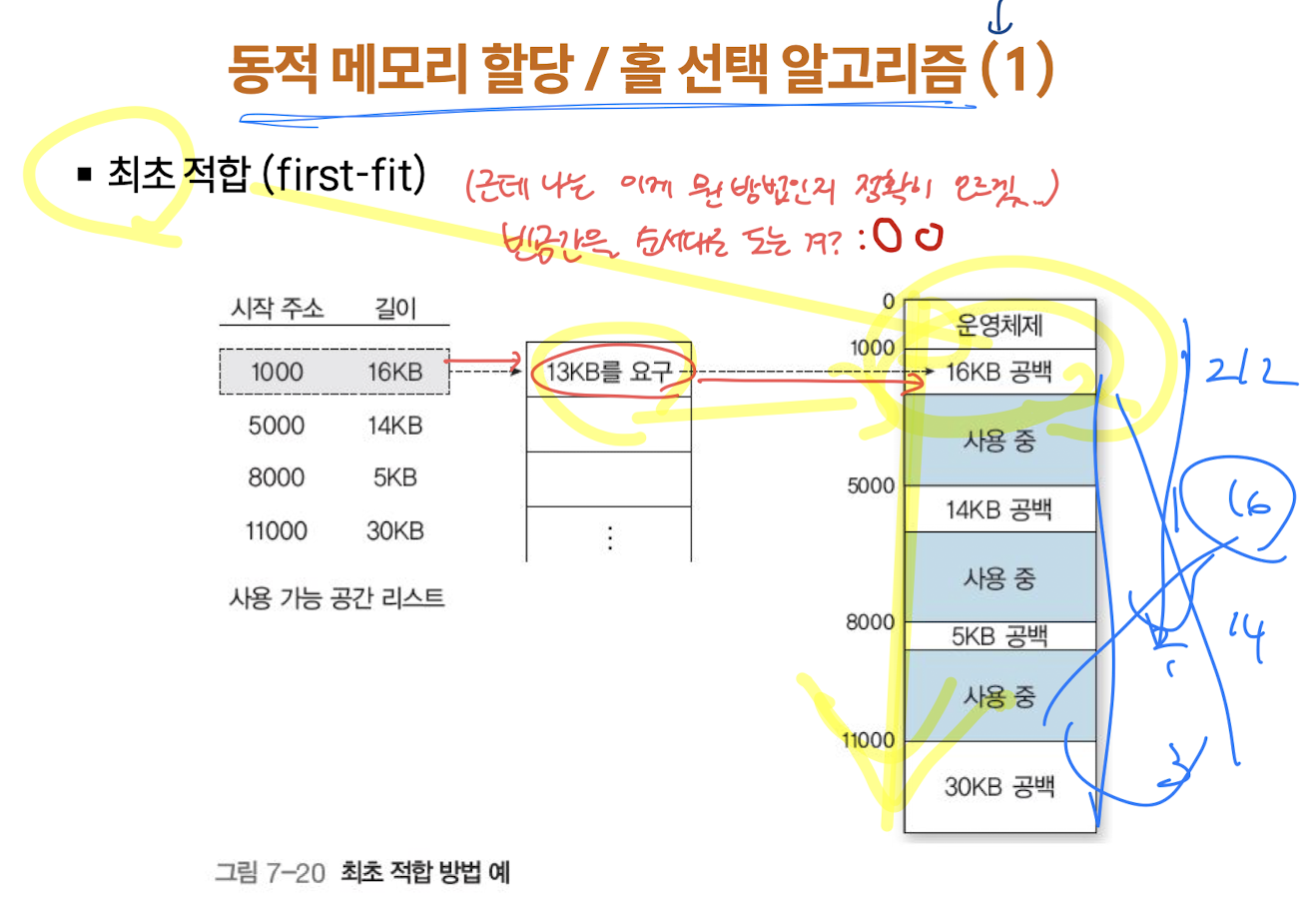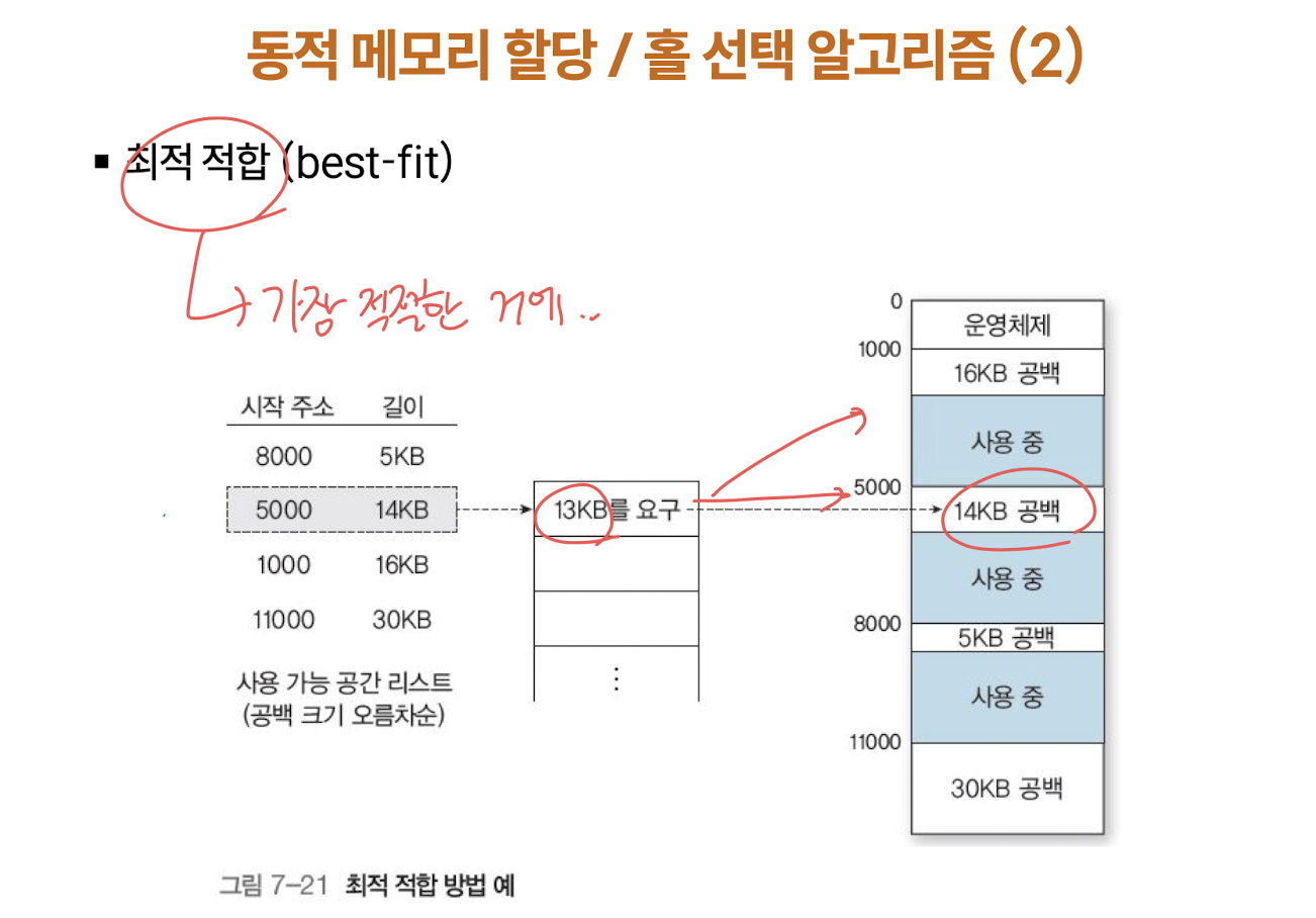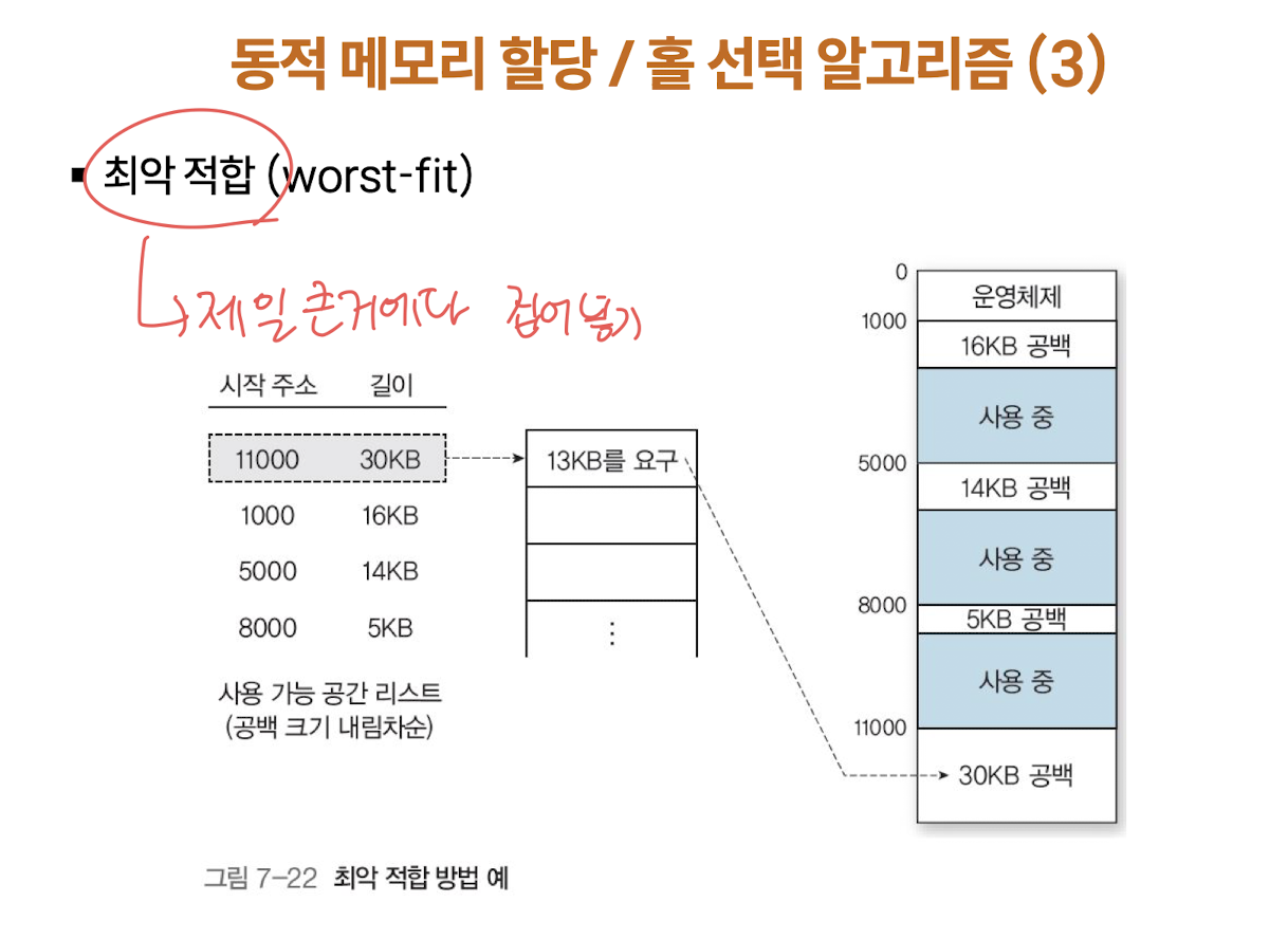 - 외부 단편화 : 할당된 메모리들 사이에 사용할 수 없는 홀이 생기는 현상 (가변 크기의 파티션이 생기고 반환되는 여러번의 과정에서 여러 홀 생성, 홀이 프로세스의 크기보다 작으면 할당 불가 )