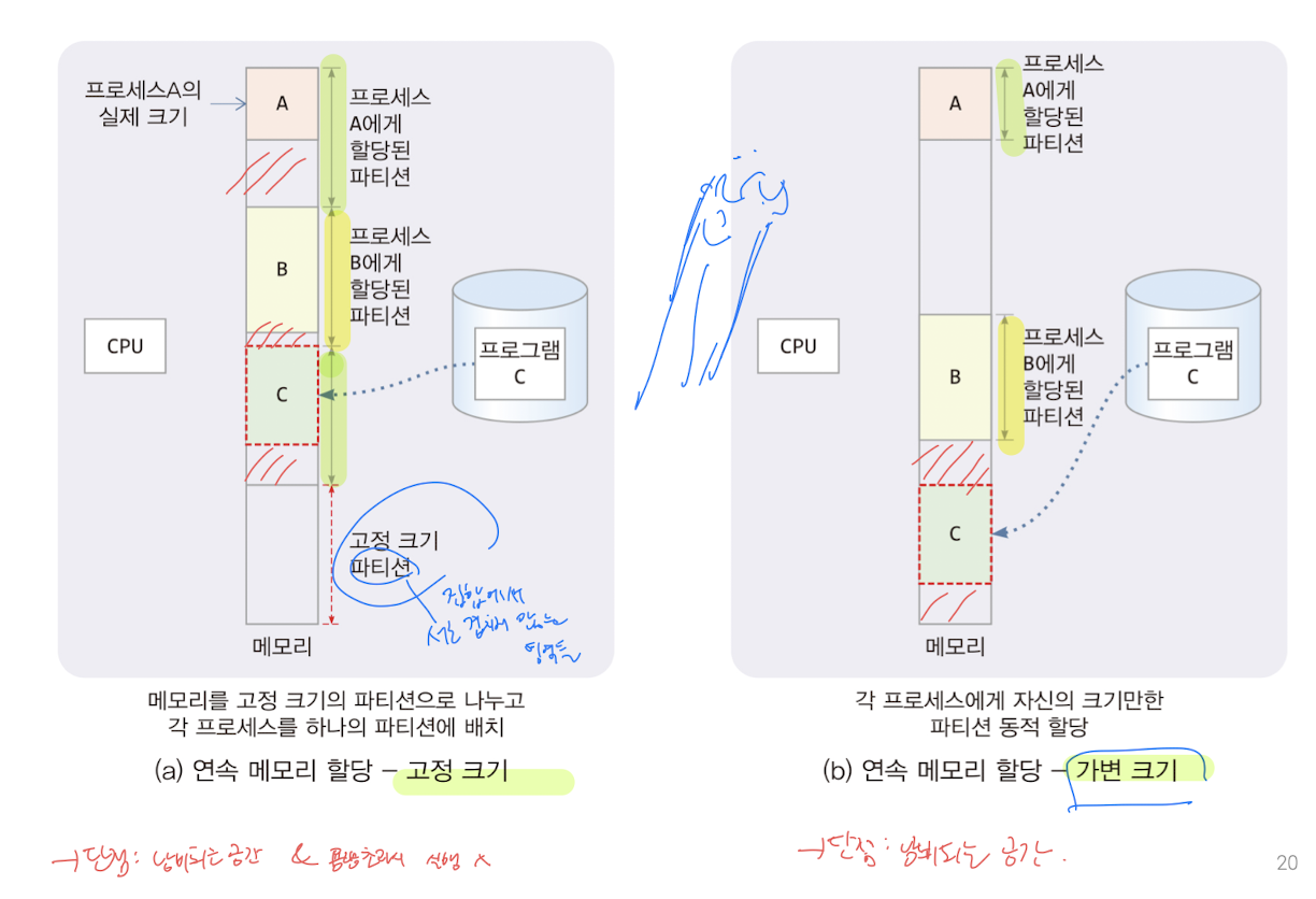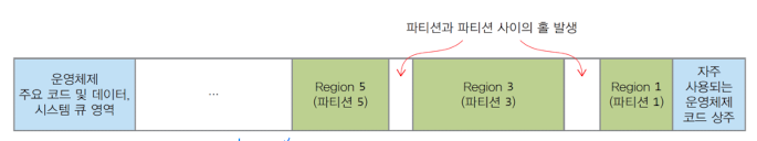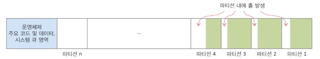 - 내부 단편화 : 할당된 메모리 내부에 사용할 수 없는 홀이 생기는 현상 (파티션보다 작은 프로세스를 할당하는 경우)