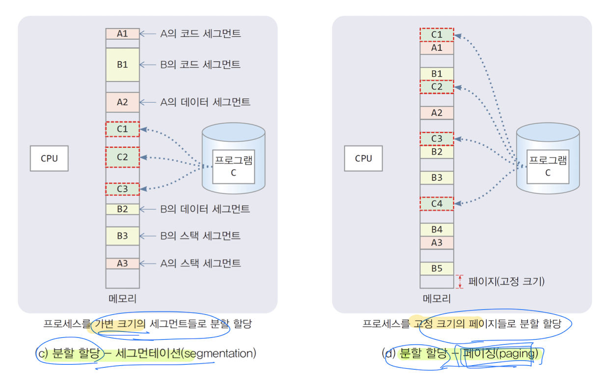 2. 분할 메모리 할당 : 프로세스에게 여러 덩어리의 메모리 할당