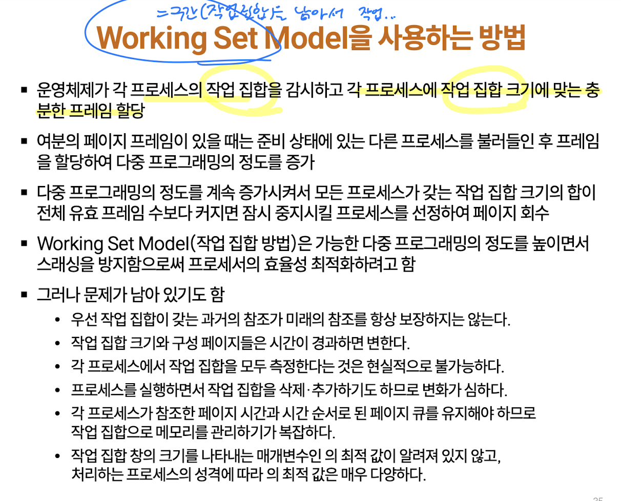 **Working Set Model(작업 집합 모델)**은 가상 메모리 관리에서 사용되는 메모리 관리 모델로, **프로세스가 일정 시간 동안 자주 참조하는 페이지의 집합(working set)**을 추적하고 이를 기준으로 물리 메모리와 페이지 교체 정책을 효율적으로 관리하기 위한 개념입니다.