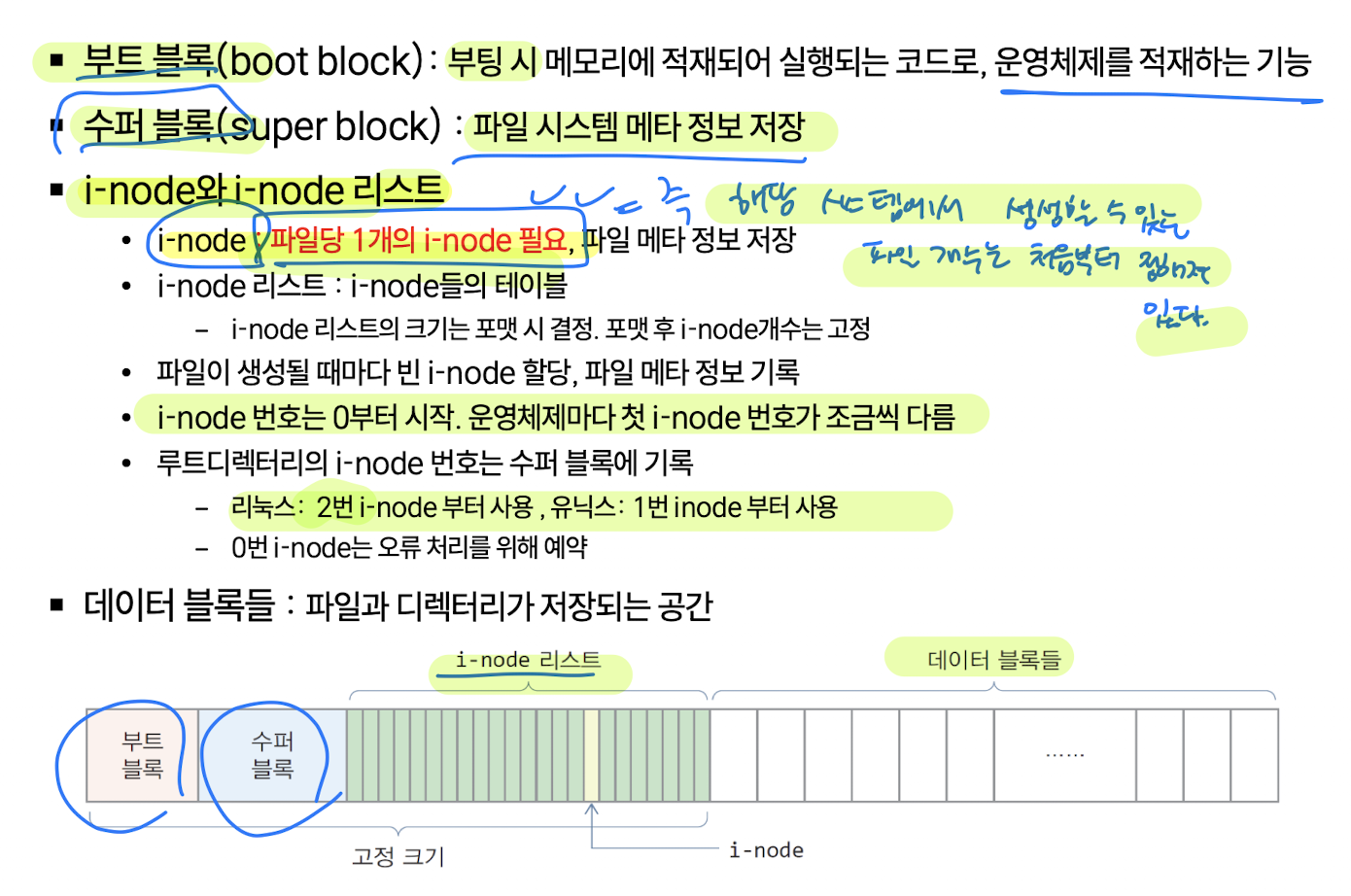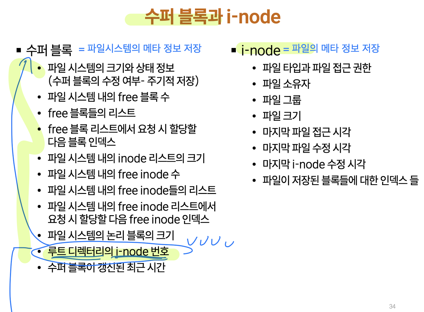 - 수퍼블록은 파일 시스템에서 중요한 메타데이터를 담고 있는 데이터 구조입니다.
