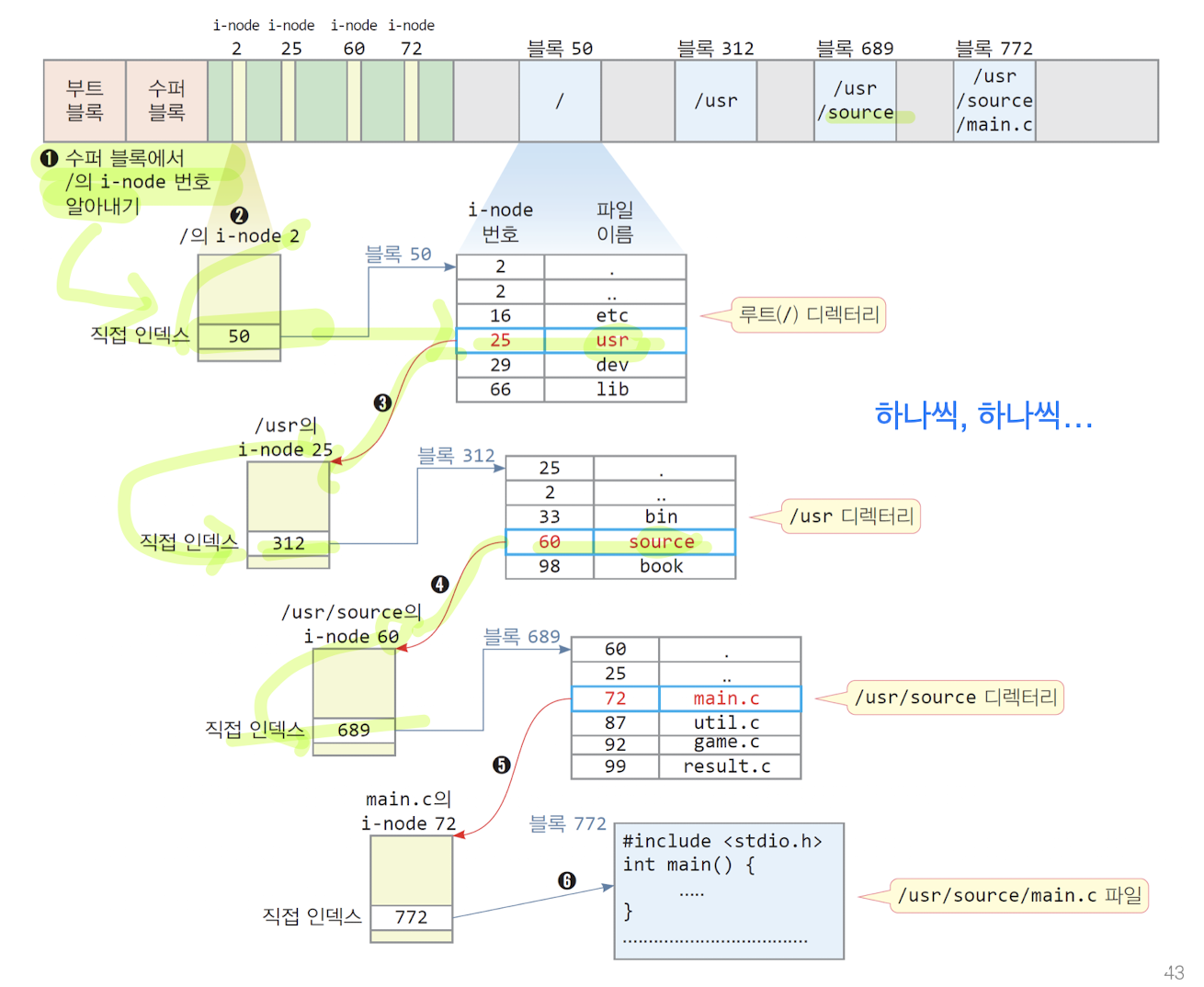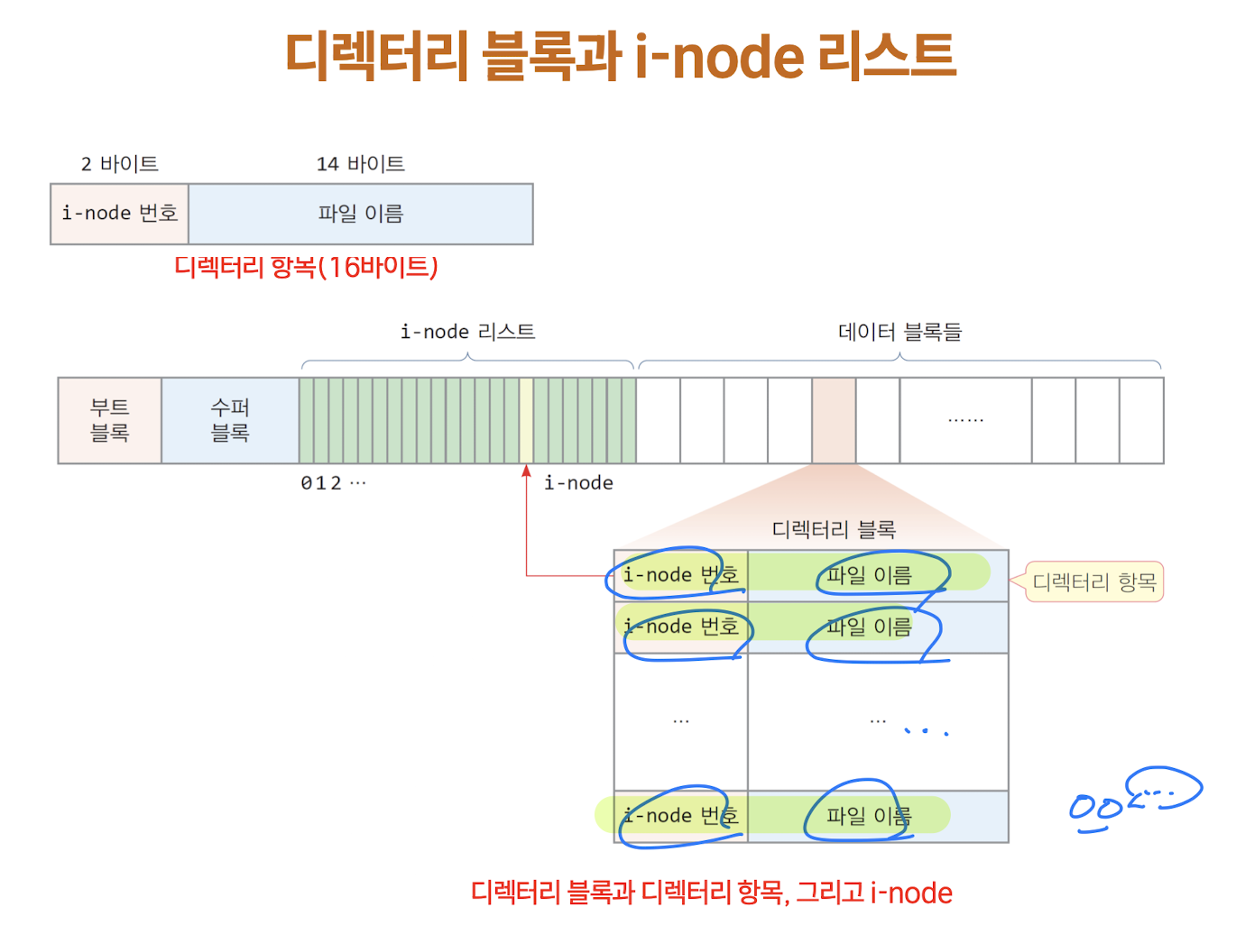 - 파일 메타데이터(파일 이름, 크기, 생성 날짜 등)는 디렉터리에 저장됨