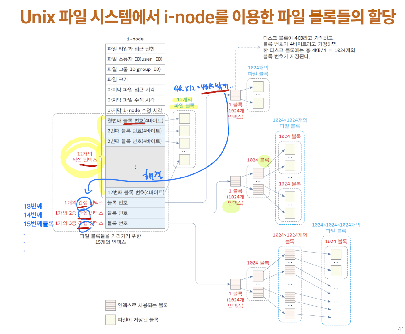 - i-node는 파일의 메타데이터(파일 크기, 권한, 위치 등)를 저장하는 구조입니다.