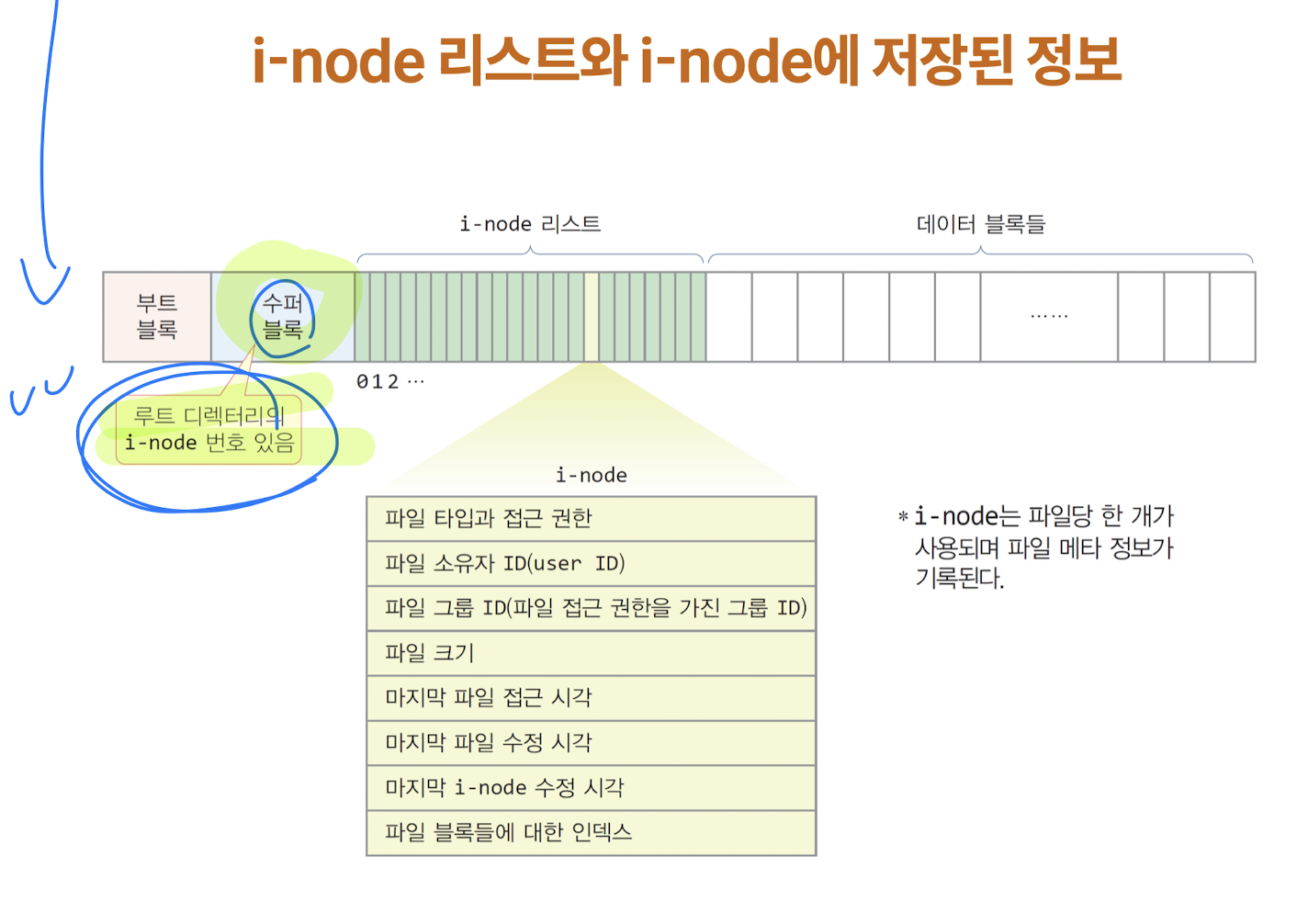 - i-node는 파일의 메타데이터(파일 크기, 권한, 위치 등)를 저장하는 구조입니다.