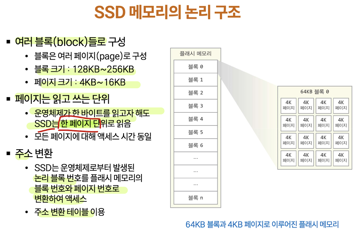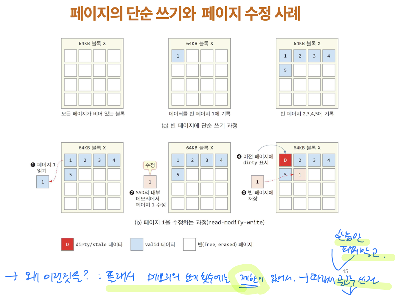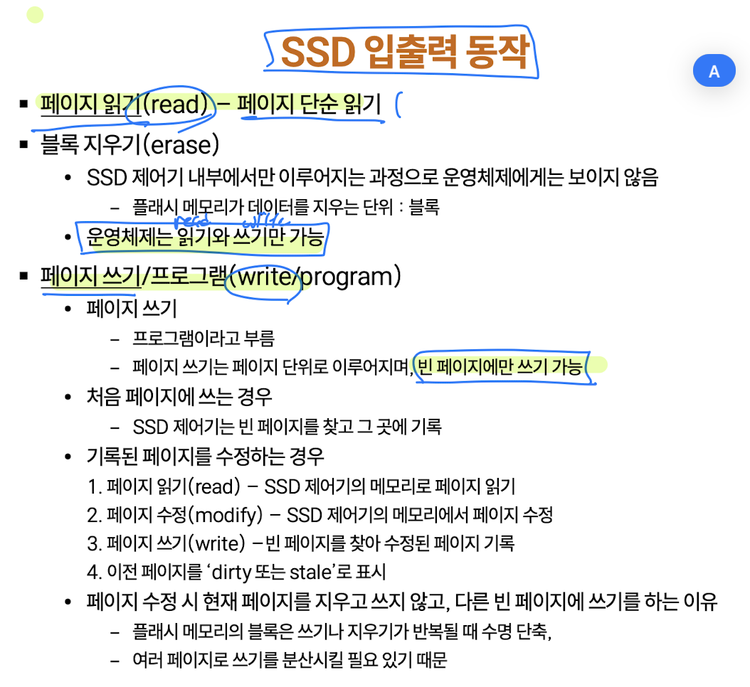 - 운영체제는 읽기와 쓰기 작업만 요청하지만, 내부적으로 SSD 제어기가 페이지 단위로 데이터를 처리합니다.