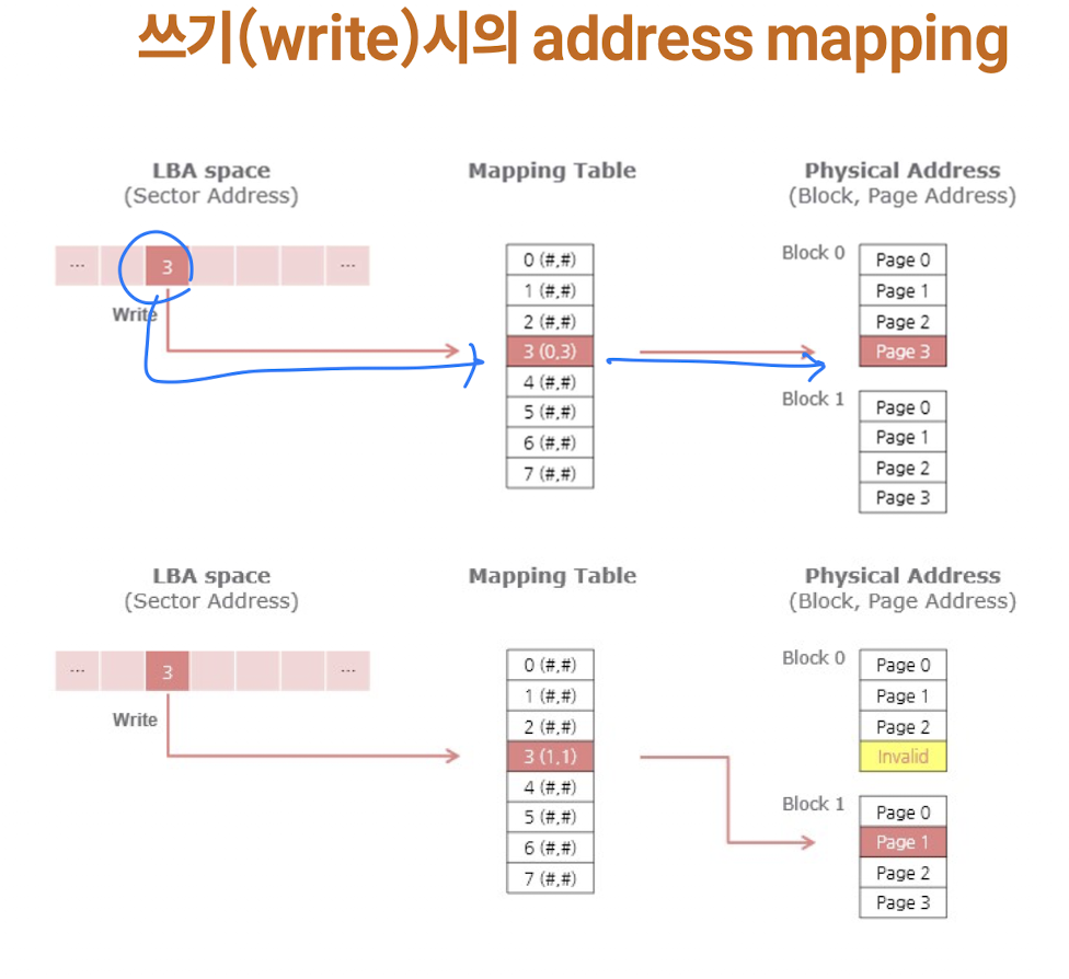 - SSD 제어기는 빈 페이지를 찾아서 데이터를 기록합니다.