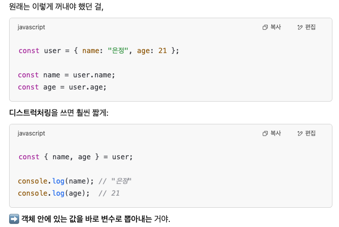 배열이나 객체 안에 있는 값을 쉽게 "꺼내오는" 문법