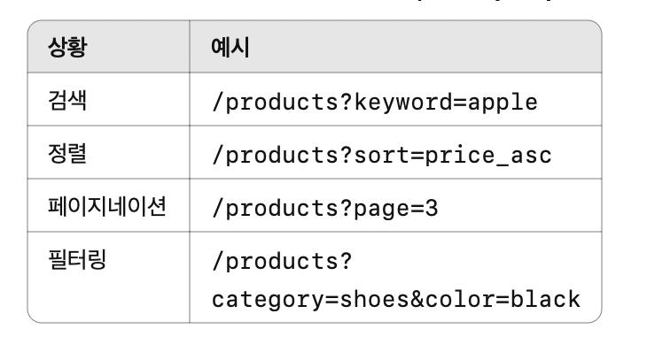 : 쿼리 파라미터는 리소스를 식별하지 않고, 필터링/정렬/페이지네이션처럼 요청을 조정할 때