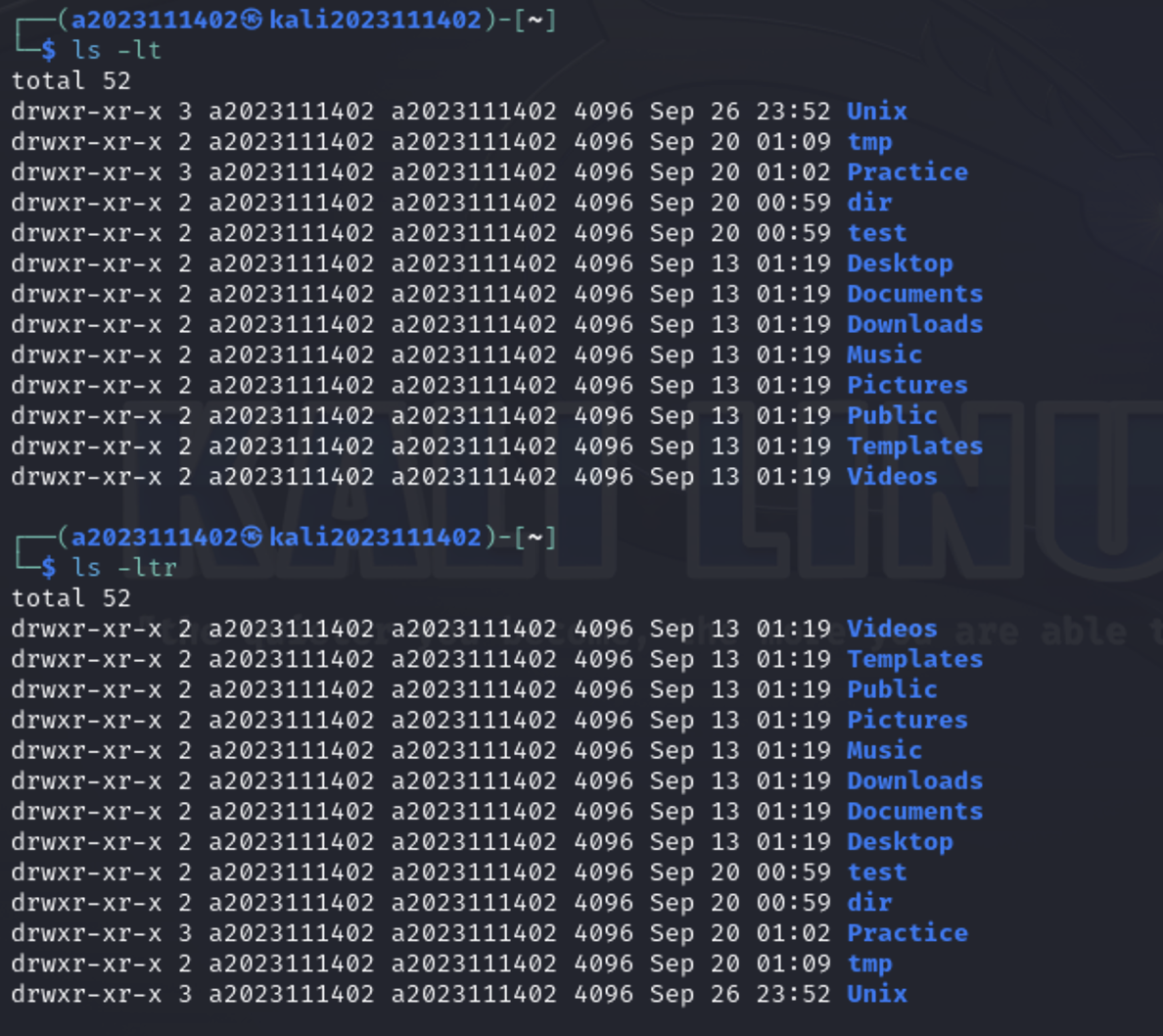 ls -lt(tl) : 현재 작업 디렉토리의 파일 목록을 시간 순(최근에 수정된 것부터)으로 출력