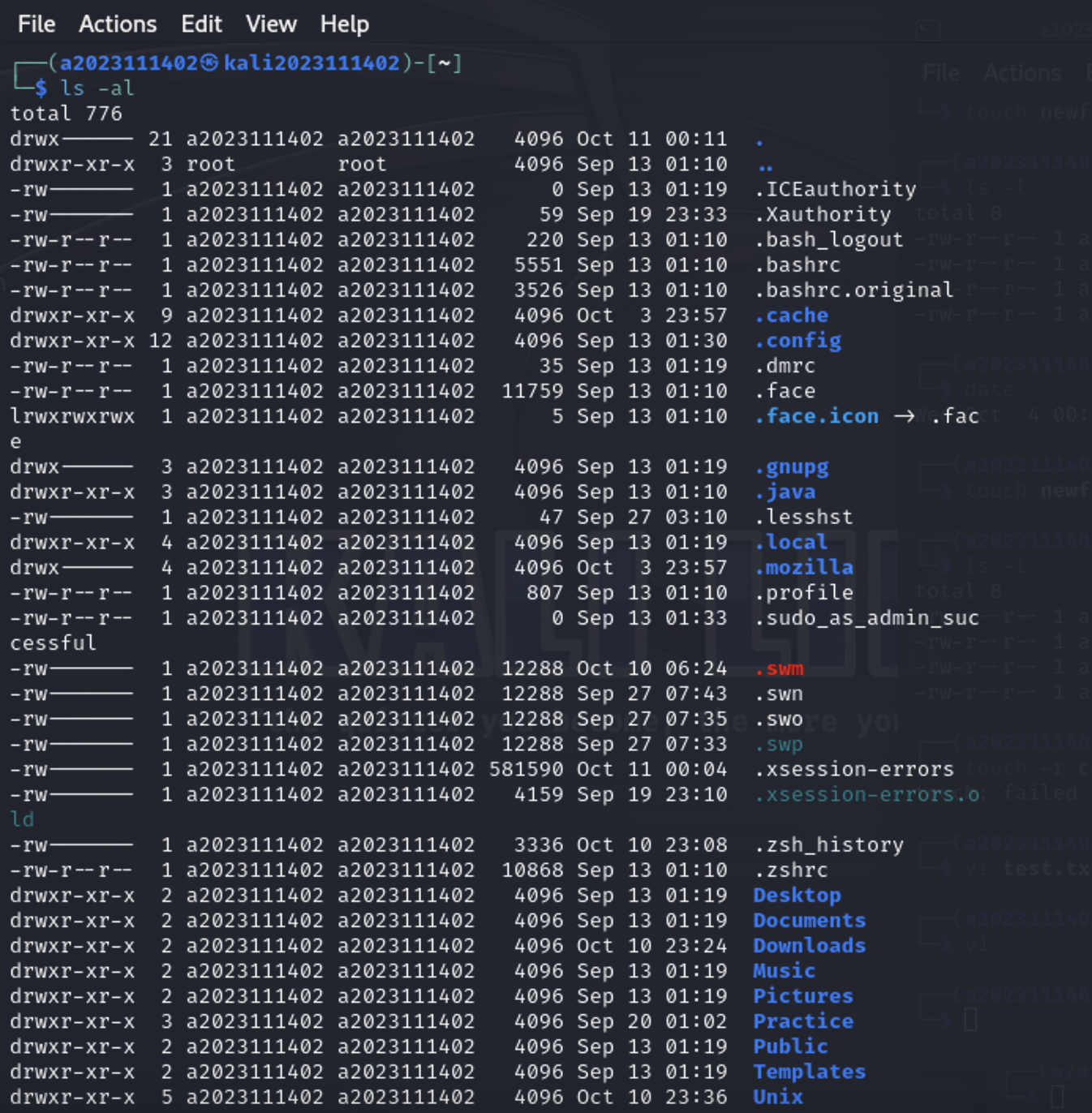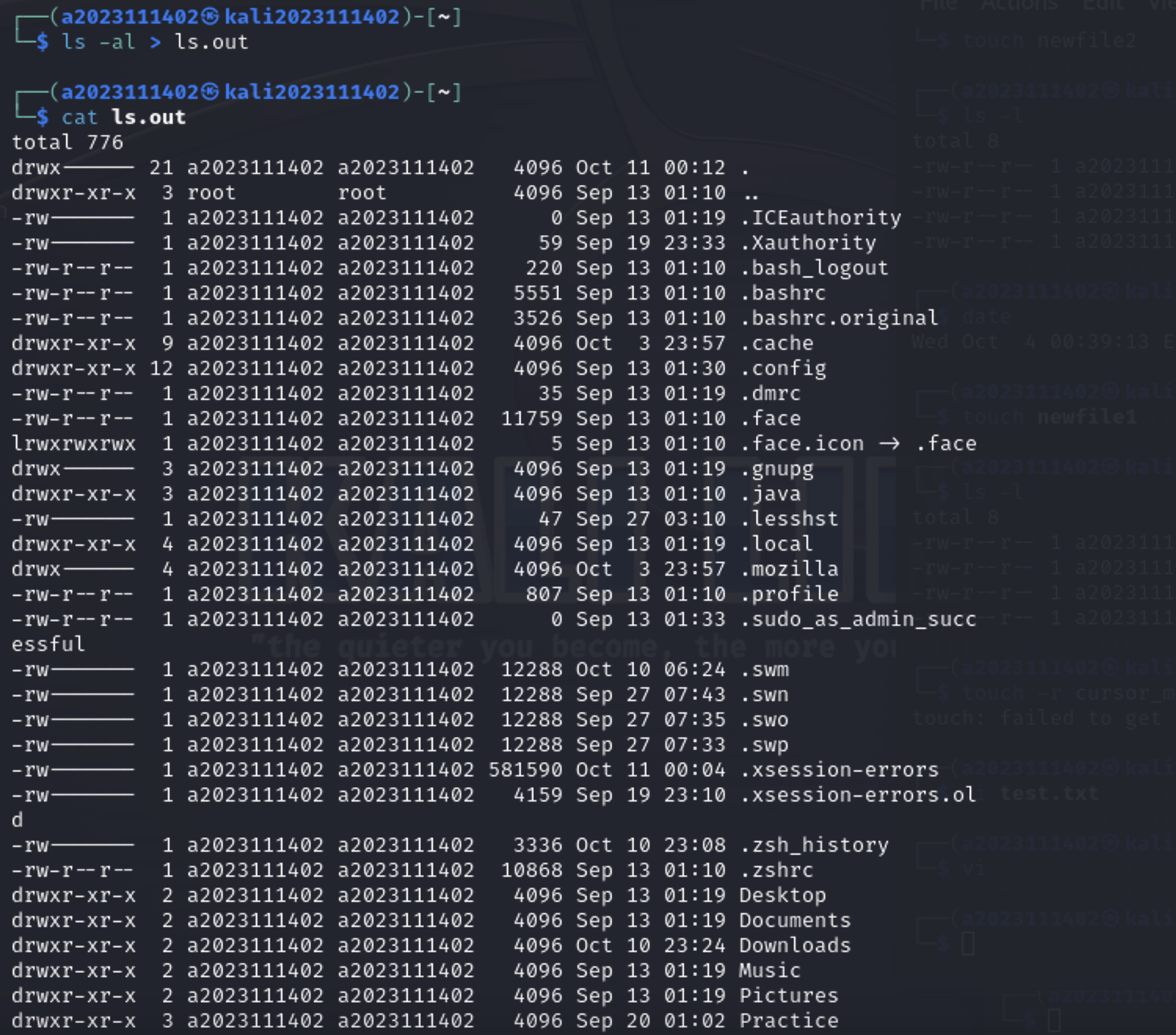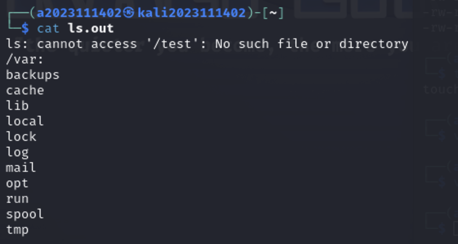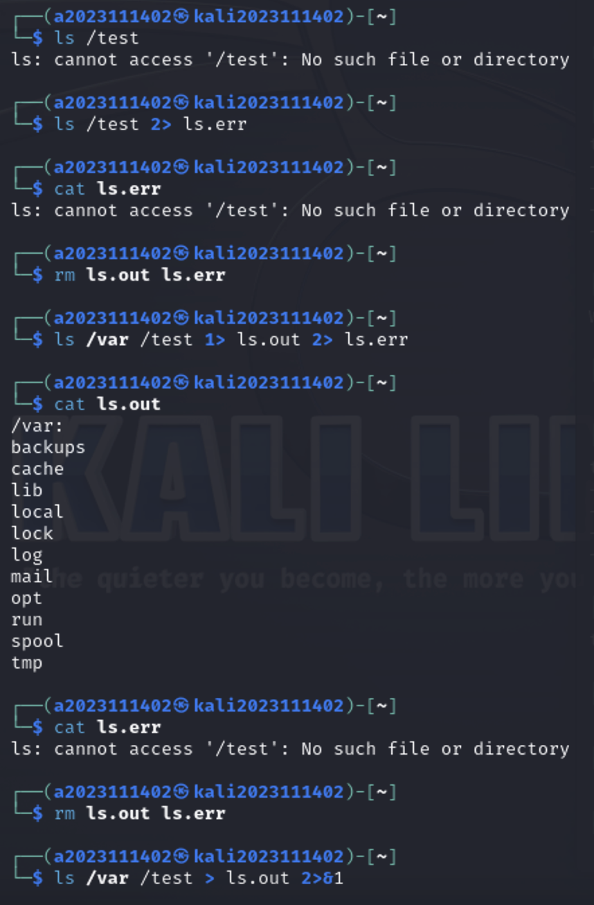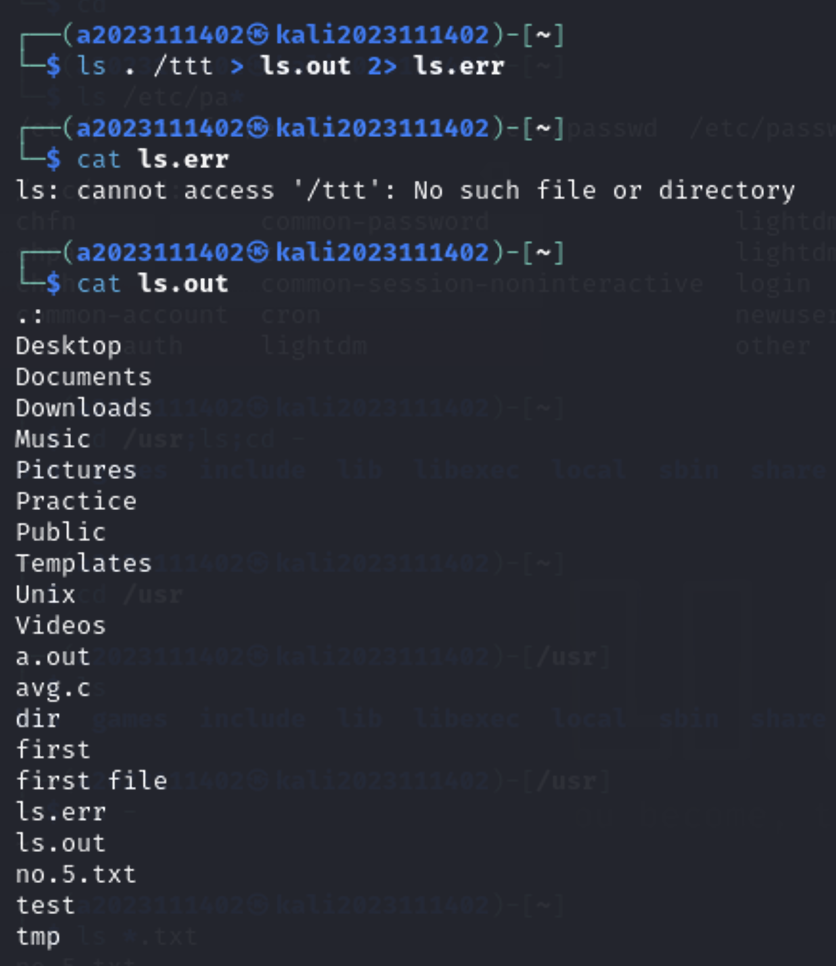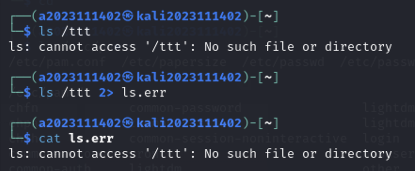 첫번째 명령에서 뜨는 것만 진짜 오류 메시지고, 나머지 cat으로 출력하는 오류메시지는 ls.err, ls.out파일에 저장된 오류메시지의 내용임