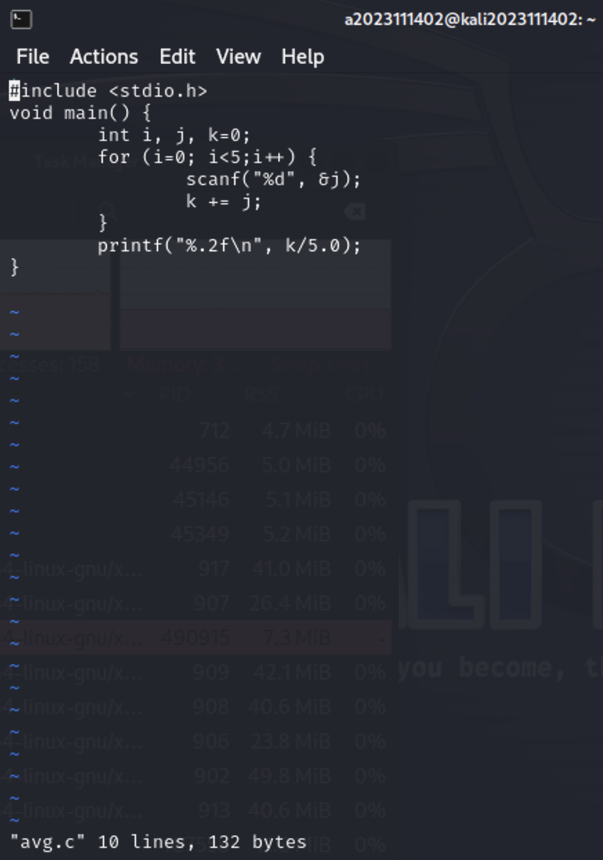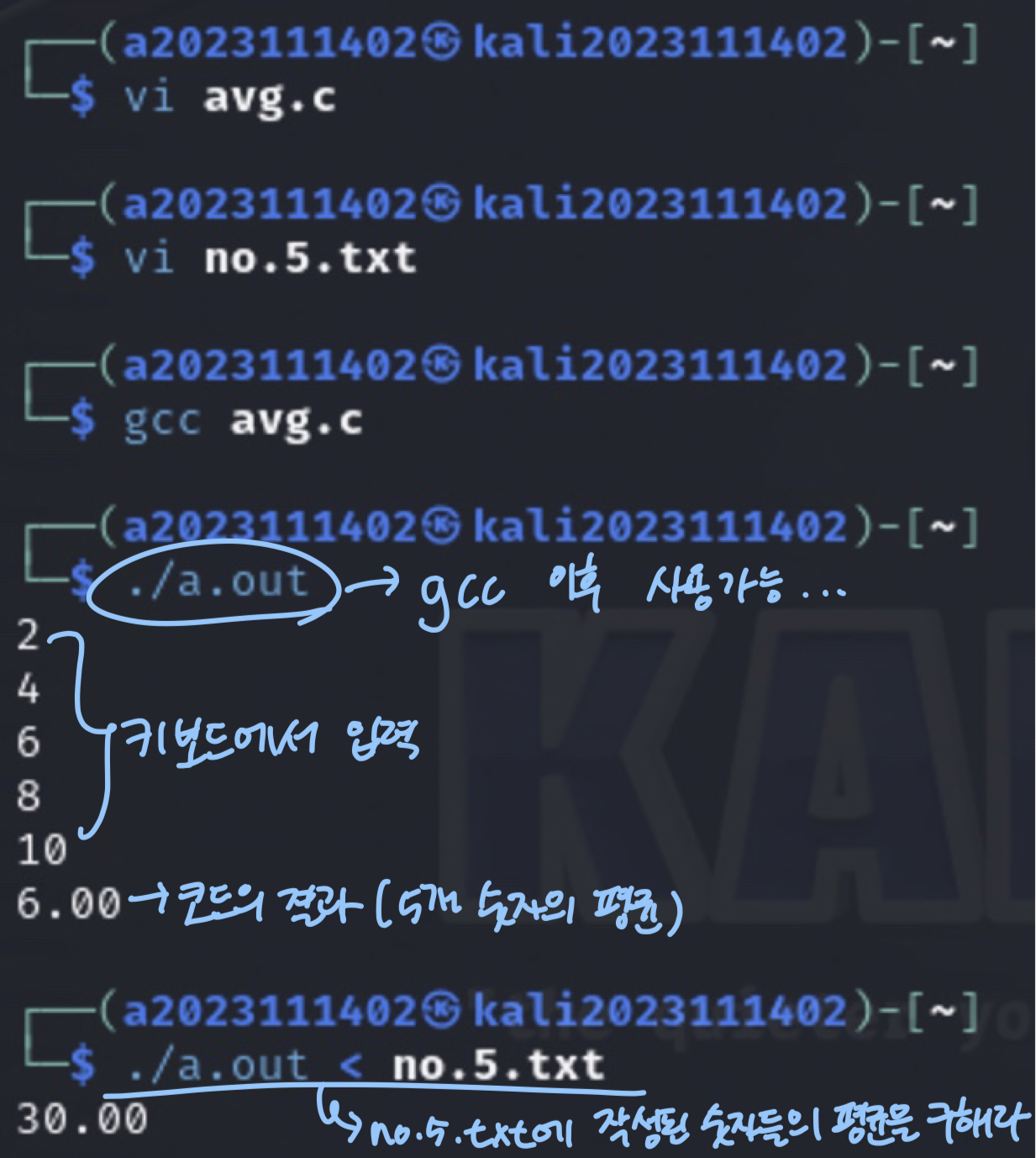 5개의 수를 입력받아 평균을 구하는 프로그램(avg.c)을 작성하고, 입력 리다 이렉션(<)으로 5개의 수를 가진 입력 파일(no.5.txt)를 사용하여 실행해 봅시 다.