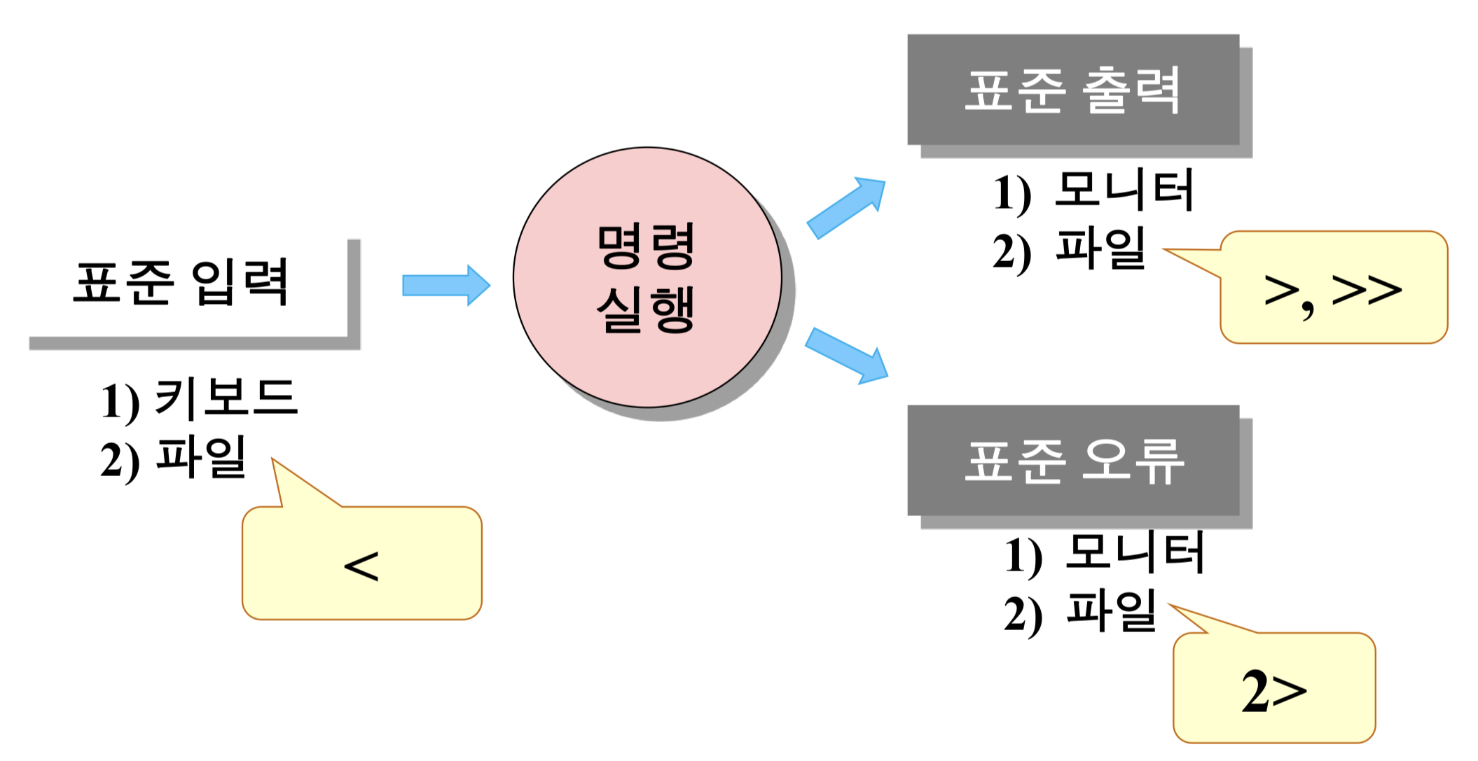 2 | stderr | 명령 실행 중 발생한 오류 메시지를 출력하는 장치 | 모니터 |