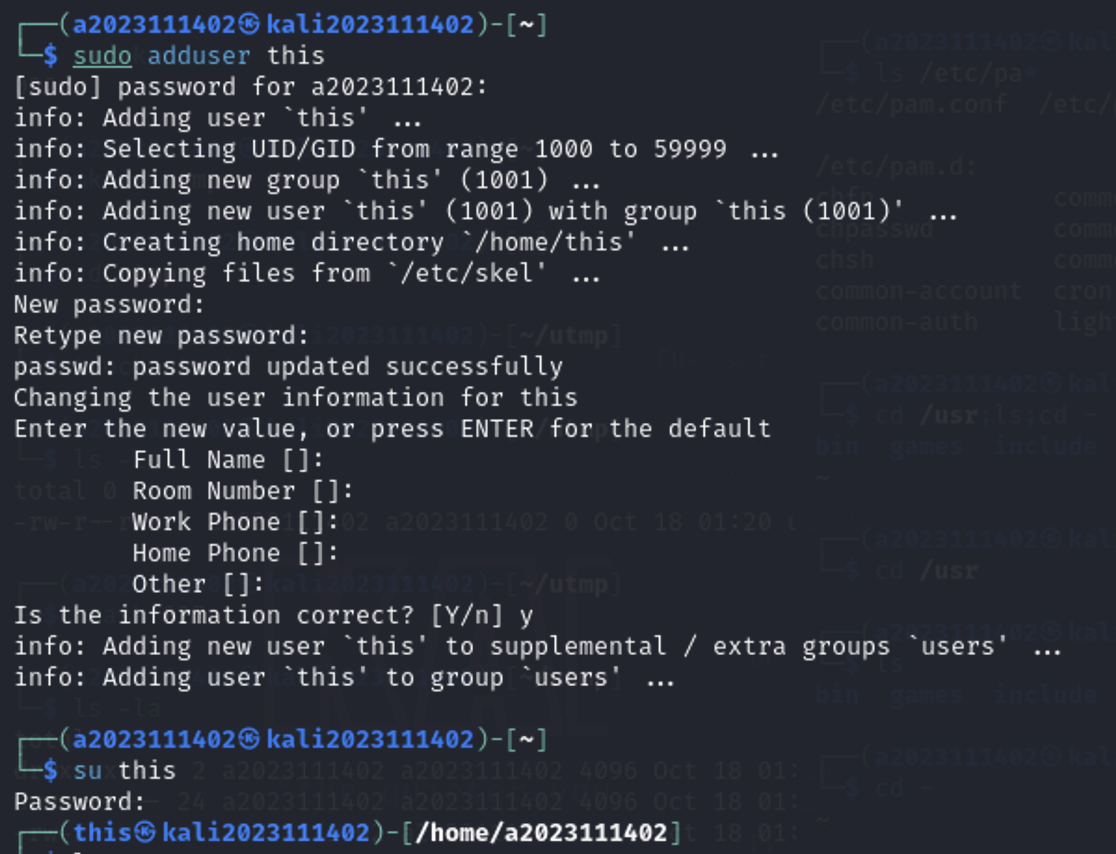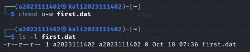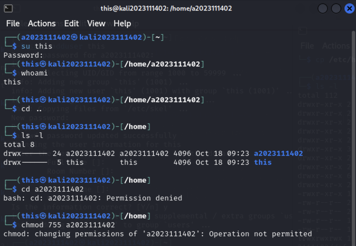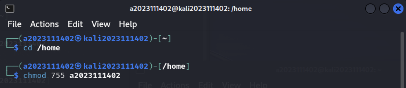 3번째 사진에서 /home/a2023111402의 접근 권한은 755이므로 other가 cd를 통해 들어갈수는 있고, ls로 파일 목록을 볼 수 있으나, 그 안에 파일을 새로 만들 수는 없다