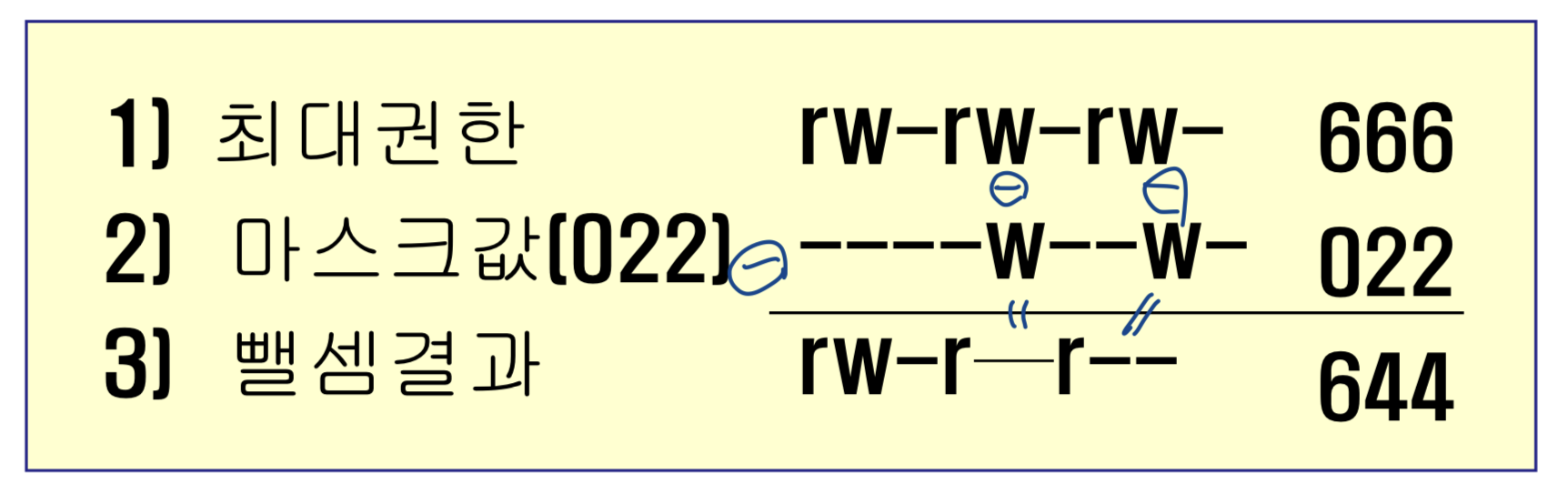 - 파일이나 디렉토리 생성시 부여하지 않을 권한 지정