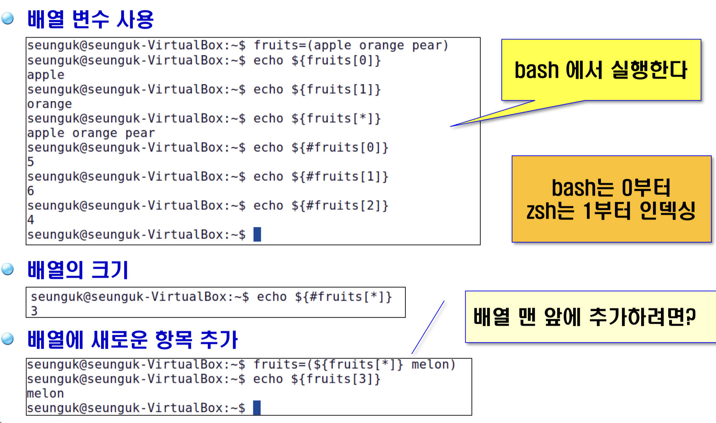 $ fruits=(apple orange pear) #항목사이에는 공백