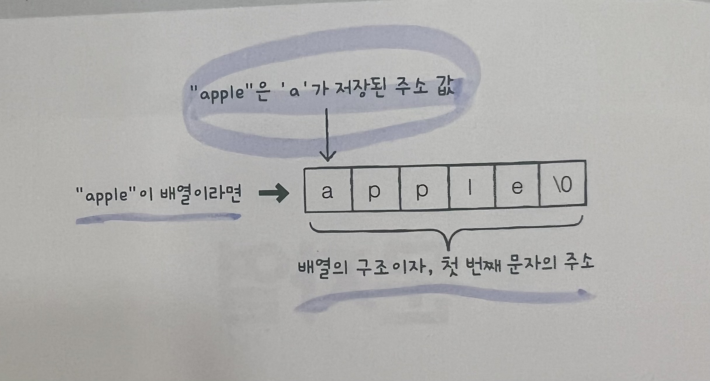 문자열은 배열의 구조를 가지며, 첫번째 문자의 주소로 쓰임