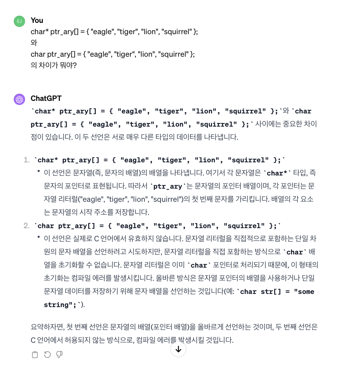 + 문자열 배열 선언시 반드시 포인터 배열로 선언해야함