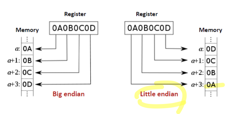 - Least significant byte has highest address (LSB가 가장 높은 주소를 가지고 있음)