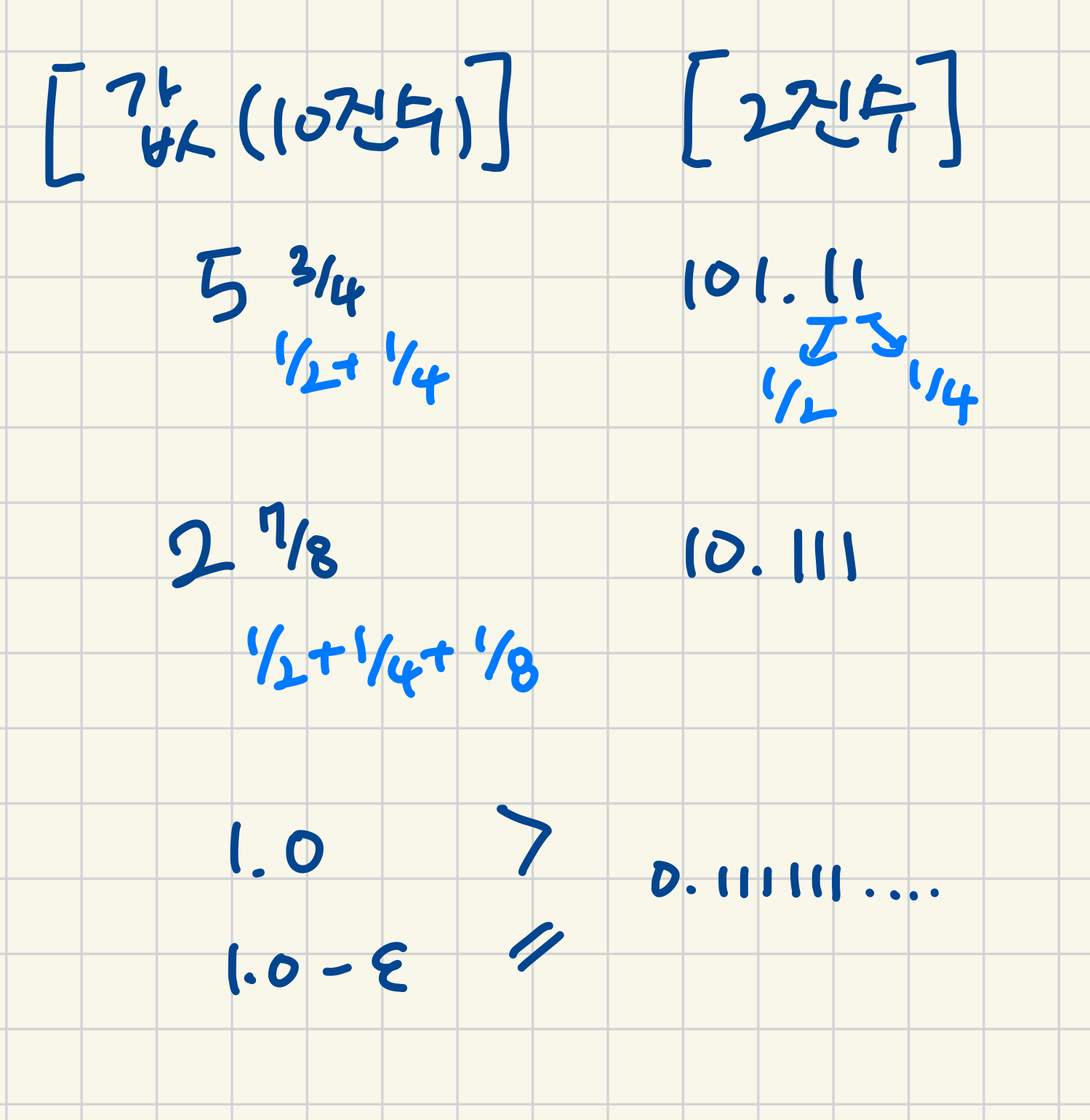 오직 x/2^k 꼴 만이 정확한 이진숫자로 표현 가능