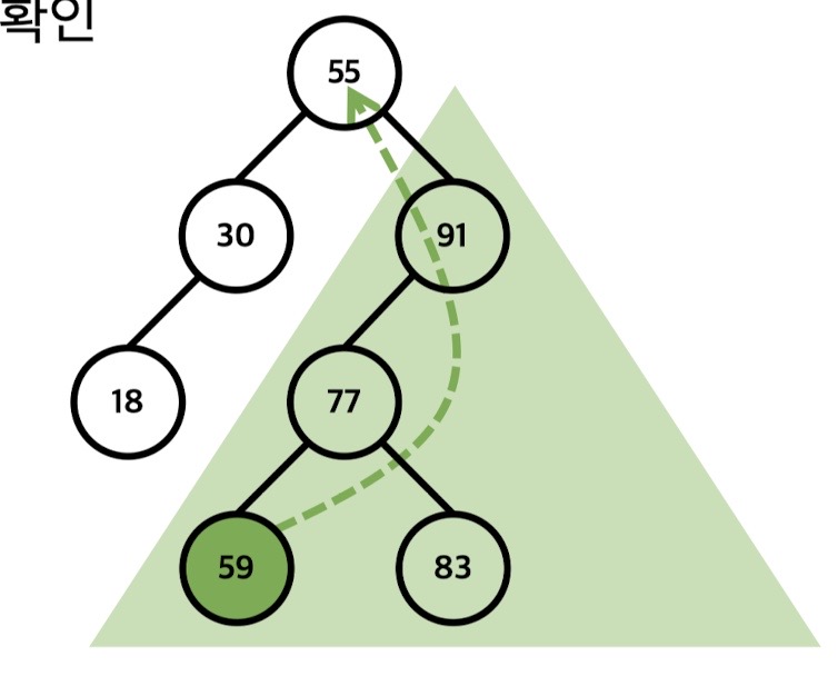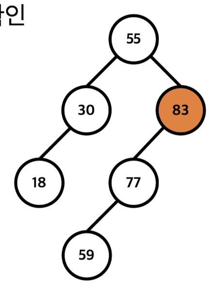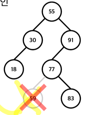 > 55를 루트노드로 가지는 (오른쪽) 서브 트리 중에서 최소원소인 59으로 교체