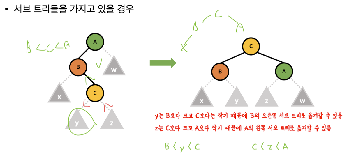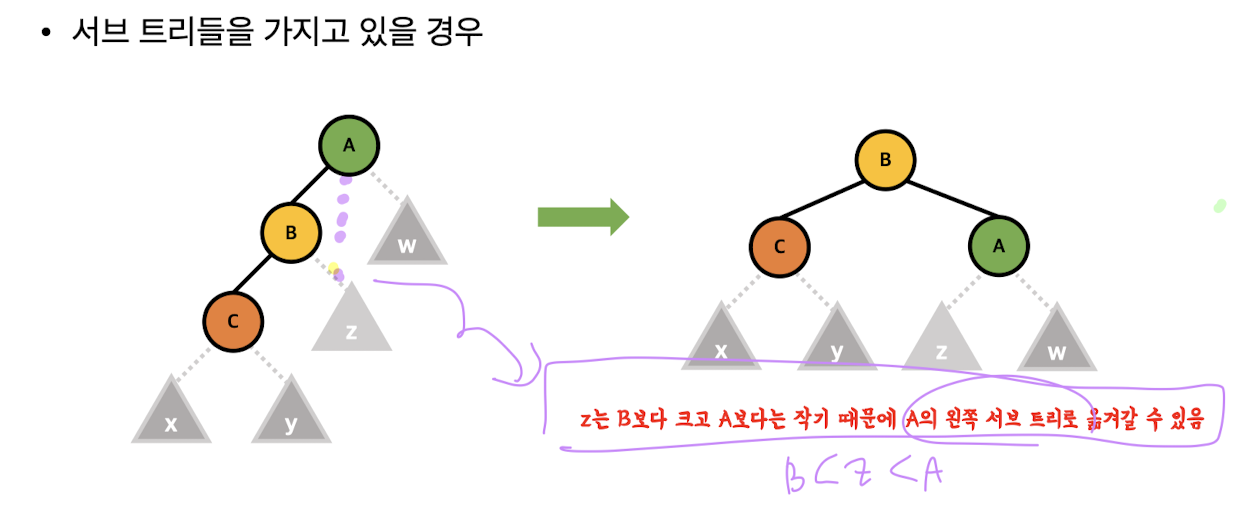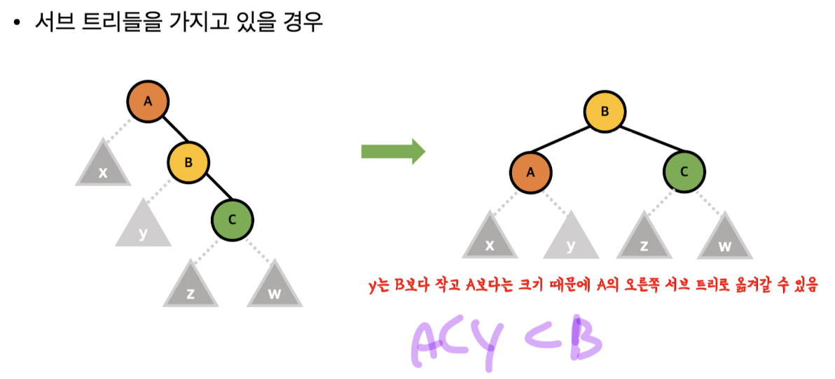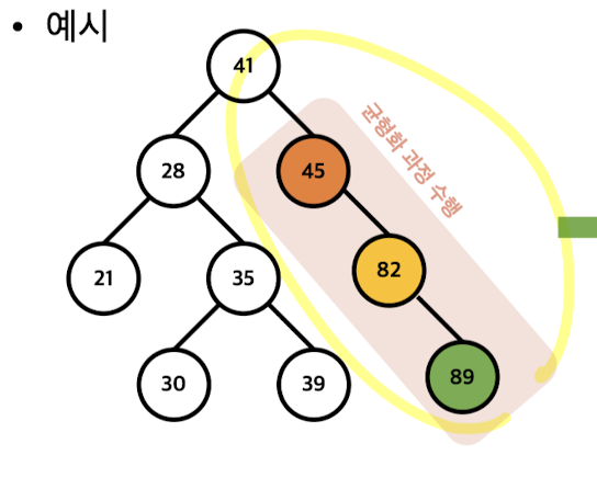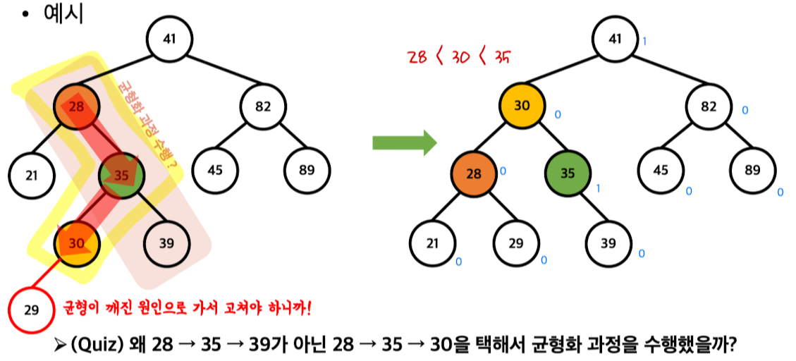 3. AVL 트리의 조건(성질)을 불만족하는 노드 발견시 트리의 균형화 과정 수행