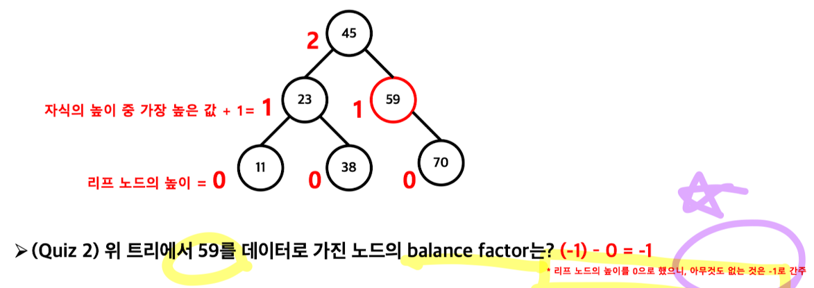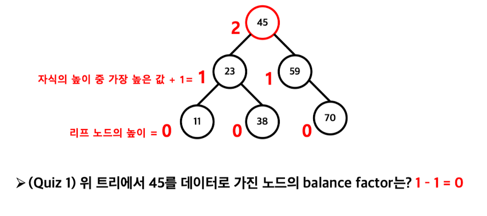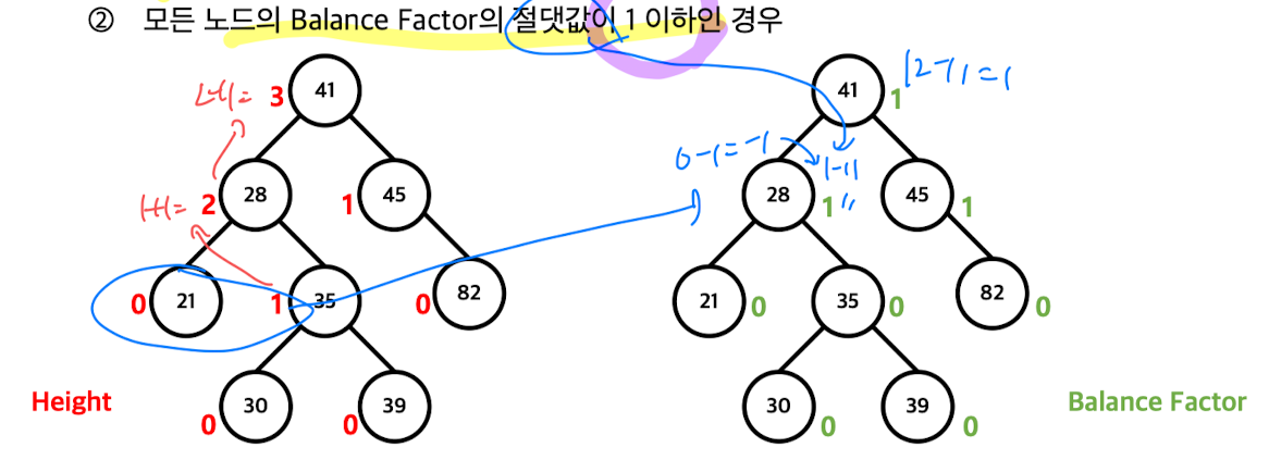 임의 노드의 Balance Factor= 좌측 서브트리의 높이 - 우측 서브트리의 높이